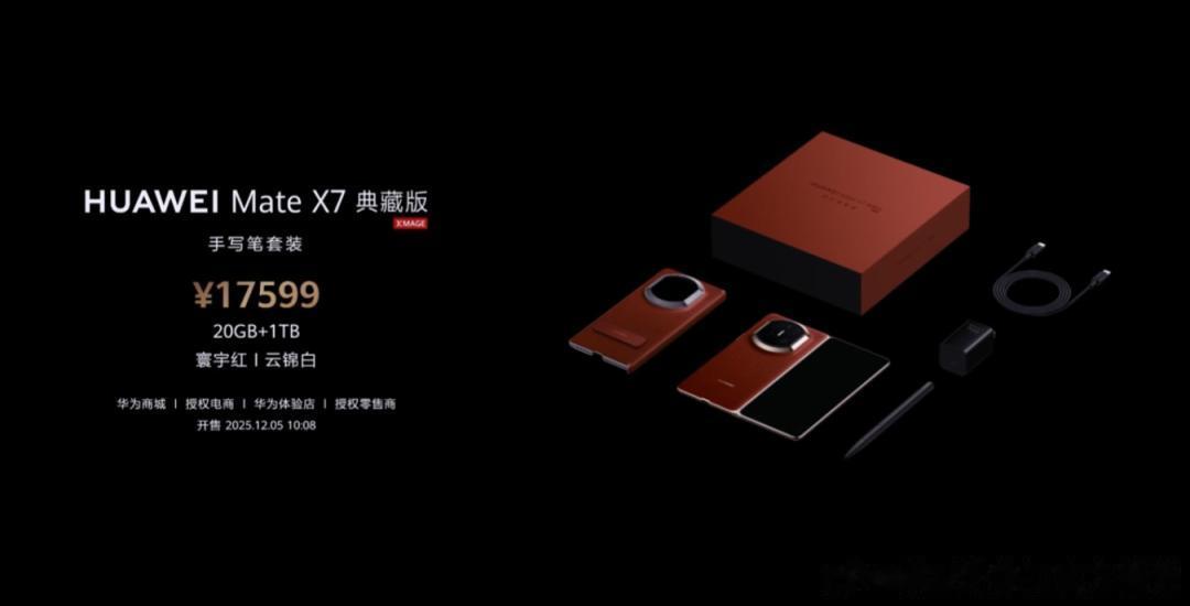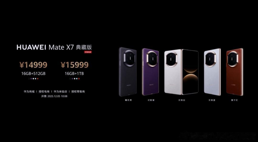 HUAWEI Mate X7将于2025年12月05日10:08正式开售,建议零售价12999元起。