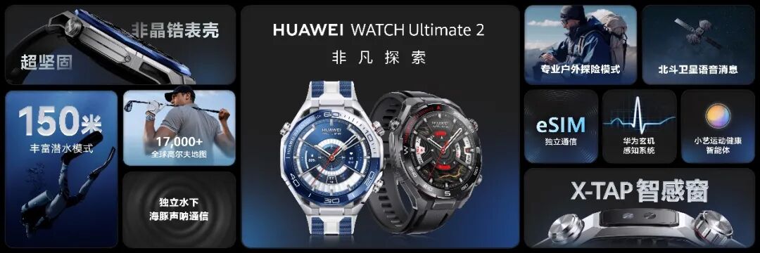 探险者的终极装备HUAWEI WATCH Ultimate 2非凡探索智能腕表正式发布作为非凡探索系列的第二代产品,HUAWEI WATCH Ultimate 2 非凡探索迎来重大升级,采用创新防水系统实现150米潜水级防水,并首发海豚声呐通信技术,实现水下双向通信与水下SOS求救。相较上一代支持的文字消息,本代首次支持北斗卫星语音消息,实现单次发送最长10秒的语音消息,户外无网络极限环境下也能及时求助。此外,基于鸿蒙操作系统 6,它还支持腕上智能体,实现对运动与健康数据的快速解读;并搭载全新X-TAP智感窗,支持eSIM先锋通信,满足高端用户对运动健康与智慧生活的更高追求。