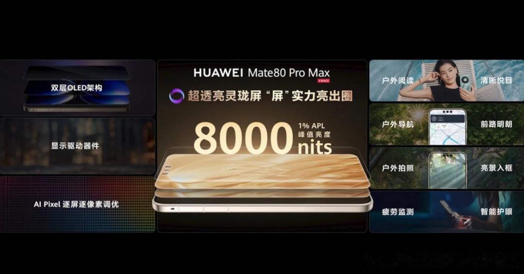 从科技突破到全面升维HUAWEI Mate 80系列以巅峰科技实力破圈全新一代HUAWEI Mate 80系列高端旗舰,持续引领创新科技与超凡智慧体验,带来四大业界首发黑科技:超透亮灵珑屏、户外探索模式、无网应急通信和第二代红枫影像。通过软硬芯垂直整合,HUAWEI Mate 80 Pro Max整机性能较上一代提升42%。以巅峰科技实力破圈,重新定义旗舰新标杆。