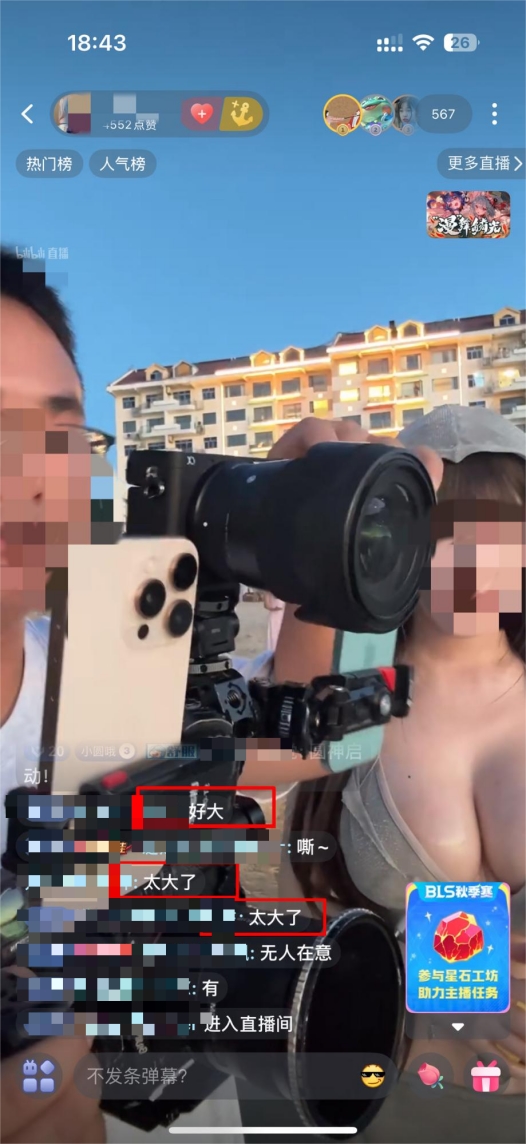 还有一部分主播以“打卡水上乐园或海边直播”为噱头开启直播,实际镜头却刻意聚焦自身暴露度过高的泳衣着装,不断用低俗姿势和刻意镜头博取关注。这种行为完全背离了分享游玩体验的初衷,将直播变成单纯展示身体的低俗秀,既突破了公序良俗的底线,也对直播生态造成不良影响,更可能给观看者尤其是青少年传递错误价值观,实属毫无下限的博眼球操作,列如“小圆”