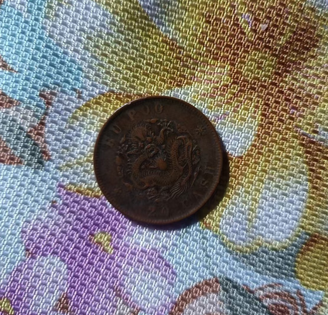 此枚“光绪元宝户部二十文”是清朝光绪年间流通的货币之一,户部光绪元宝在当时是全国通用的。正面珠圈内铸汉文“光绪元宝”四字,上环满文,下环书“当制钱二十文”,左右分列“户”“部”与梅花星点;背面为蟠龙图,外缘为英文字样,蟠龙栩栩如生,极为威严。该铜币铸造工艺精湛,字迹深刻镌秀,龙纹雕刻精美,浮雕感强烈,镜面平整光滑,纹饰的相惯线显得非常清晰,字口、纹路和边齿深峻,完全是国外铸造的样币风格,钱币表面包浆浑厚老道,沁色自然,充满岁月之痕迹与浓浓的历史沉淀感,极具观赏性,也极具收藏价值。