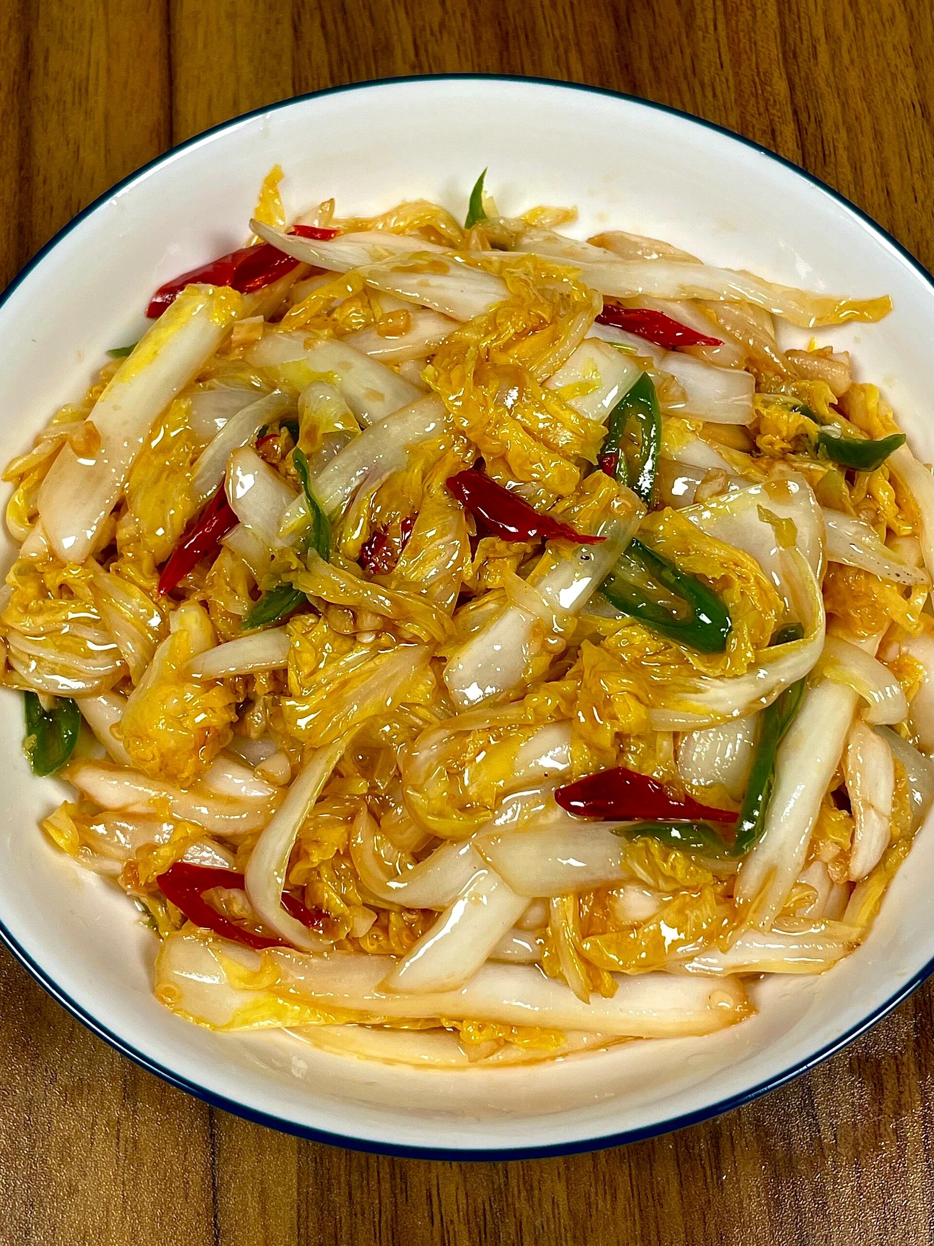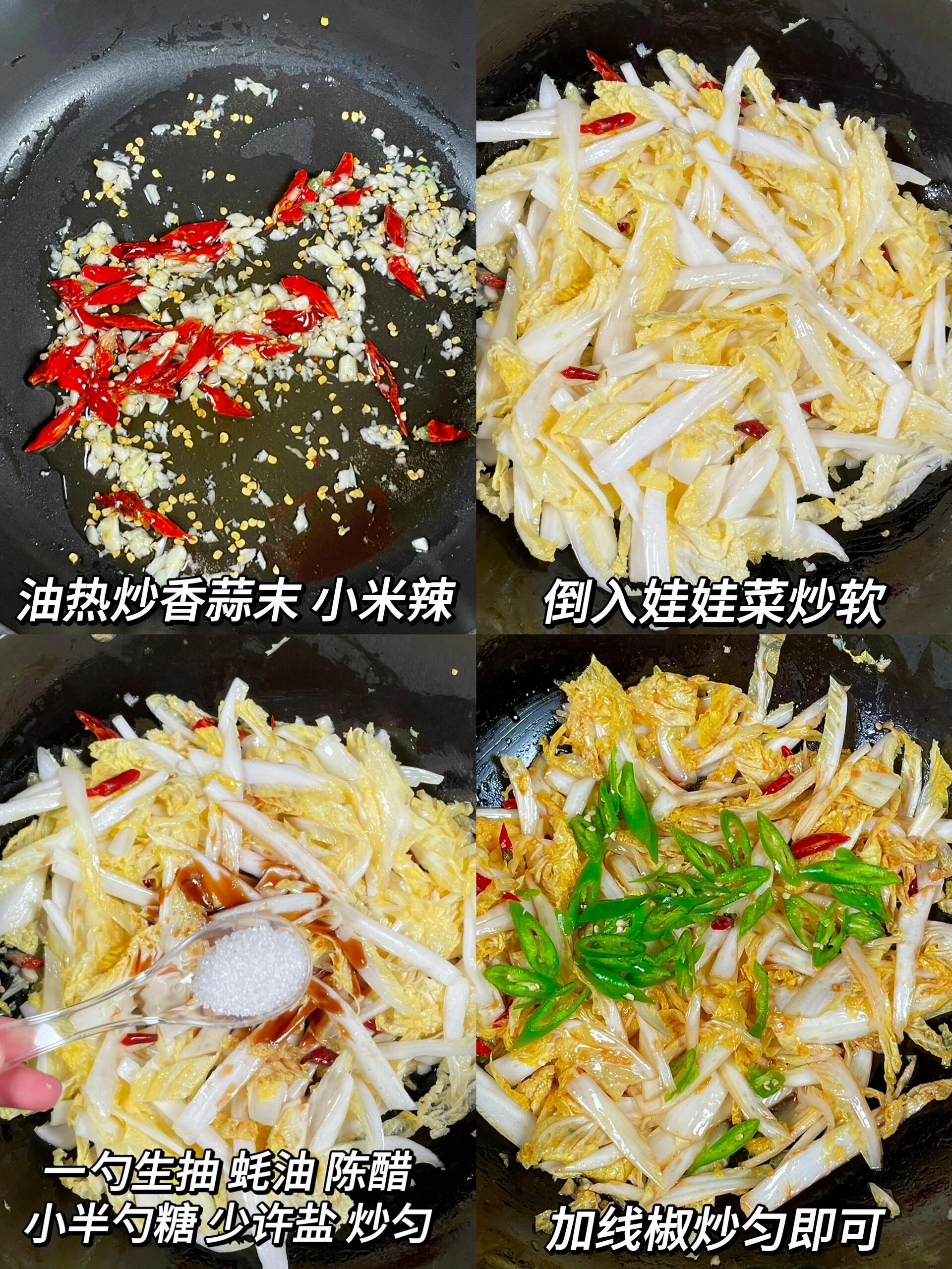 当金黄的蒜末裹着红亮的辣椒,黏在晶莹剔透的娃娃菜上,淋上闪着光泽的酸辣汁,这盘色香味俱全的料理,配上刚出锅的米饭,绝对能让你体验到勺子挖到底的快乐!偷偷告诉你,剩下的酱汁别倒掉,第二天拌凉面简直绝了!