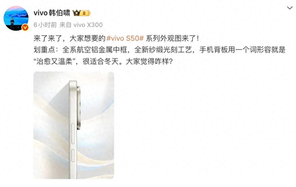 今天,vivo通信科技有限公司产品经理韩伯啸在最新预热中展示了vivo S50系列外观图,并表示“全系航空铝金属中框,全新纱缎光刻工艺,手机背板用一个词形容就是“治愈又温柔”,很适合冬天。”
