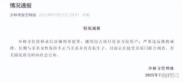 7月27日,“少林寺官方网站”微信公众号及少林寺管理处同步发布情况通报:少林寺住持释永信涉嫌刑事犯罪,挪用侵占项目资金及寺院资产,严重违反佛教戒律,长期与多名女性保持不正当关系并育有私生子,目前正接受多部门联合调查。