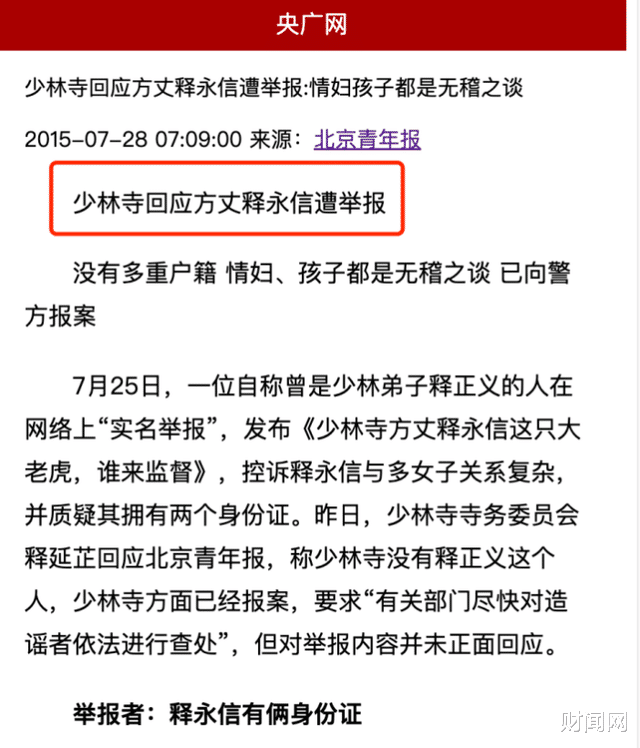 2015年7月,网帖《少林寺方丈释永信这只大老虎,谁来监督》举报其拥有双重户籍、与释延洁(少林慈幼院院长)育有私生女等问题。调查结果显示,其双重户籍系历史遗留问题,已依法注销,相关指控证据不足。