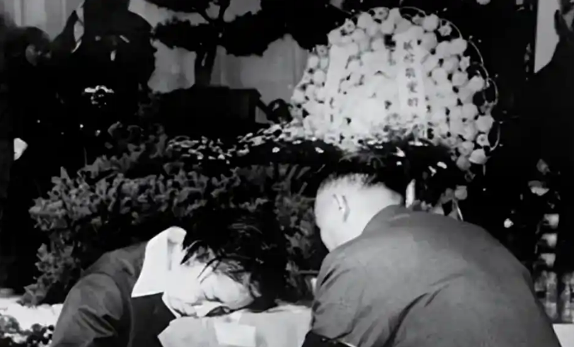 王光美抱着丈夫的骨灰盒,泪水滑落。