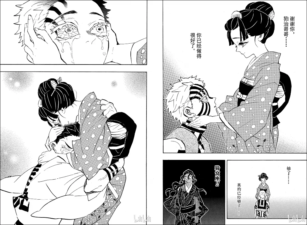 而在与主角炭治郎的战斗中,他被堂堂正正正面击败,在濒死之际他想起了自己的父亲、恩师、妻子,情绪终于爆发,执念消散,结束了自己的一生。