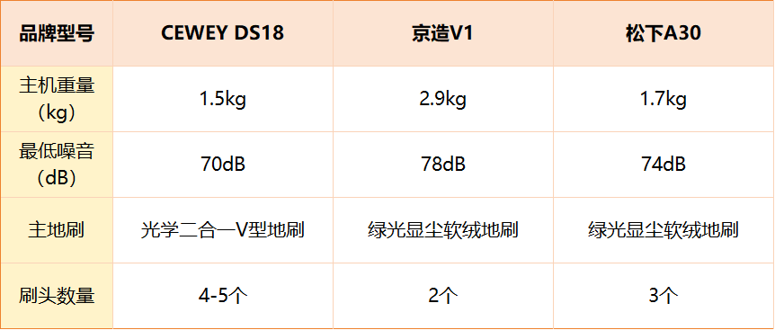 从实际使用体验上看,CEWEY DS18 依旧延续轻量与静音的平衡设计。主机仅1.5kg,噪音控制在70dB,操作轻便、长时间使用不疲劳。标配光学二合一V型地刷,并配有4~5个多功能刷头,能覆盖地板、地毯、沙发、床褥等多种场景。京造V1和松下A30的话,主机重量都偏重,而且在噪音控制方面也还是偏高了。综合比较,CEWEY DS18 在重量控制、静音体验与刷头适配灵活度方面表现更优,整体使用感受更轻盈舒适。