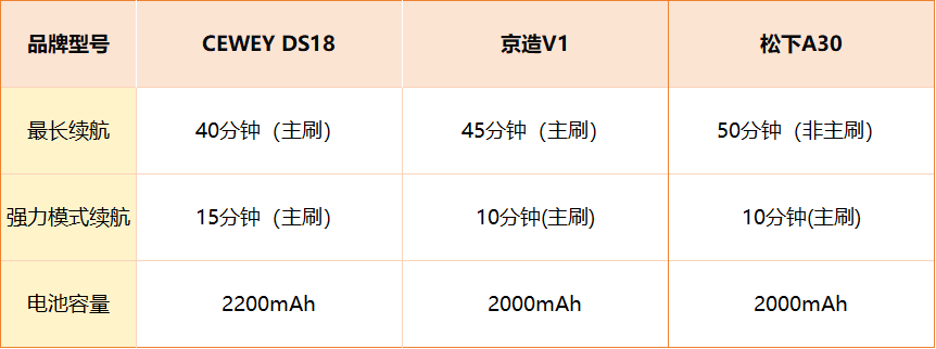 在续航表现方面,CEWEY DS18 标准模式可连续使用40分钟(主刷),强吸模式续航15分钟,搭载2200mAh锂电池。CEWEY与京造V1、松下A30相对比,整体来看,三款机器的续航表现相近,但CEWEY在强吸模式下续航更持久,能兼顾高功率输出与稳定时间,适合深度清洁。