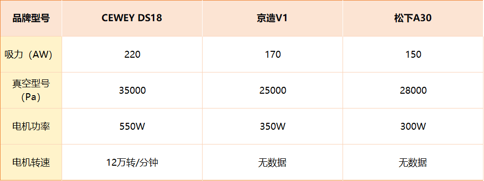 由上图数据可知,CEWEY DS18 在同价位机型中依旧保持高水准。它搭载最大吸力220AW、真空度35000Pa,电机转速高达12万转/分钟,能持续提供强劲吸力。京造V1和松下A30吸力整体表现偏中端。综合对比,CEWEY DS18在吸力强度、真空效率与能耗控制之间的平衡度更佳,清洁力更稳定。