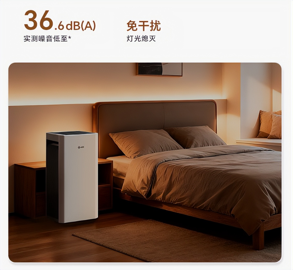 三、暖气房友好细节:静音节能,24小时开无负担1. 静音无光,不扰夜眠睡眠档噪音实测36.6dB,仅比翻书声略轻,贴床头1米外完全无感知。搭配超敏光感息屏,关灯后1秒自动熄屏,无噪音无强光污染,浅眠者和宝宝家庭可安心24小时开启。