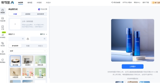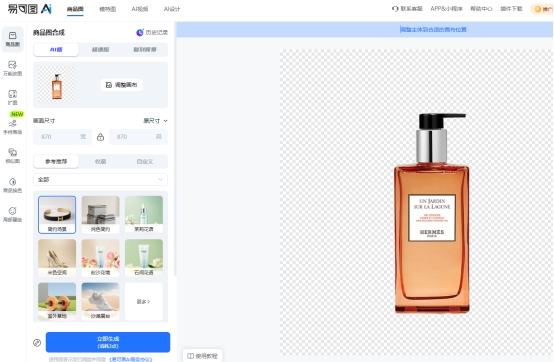 易可图是一款面向电商场景的AI设计工具,在商品图生成方面的功能非常全面,覆盖从基础抠图到复杂场景合成的多个环节。