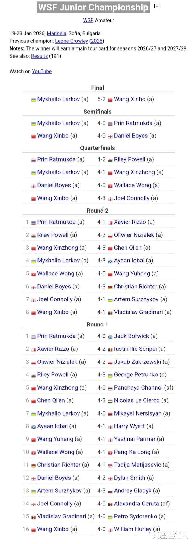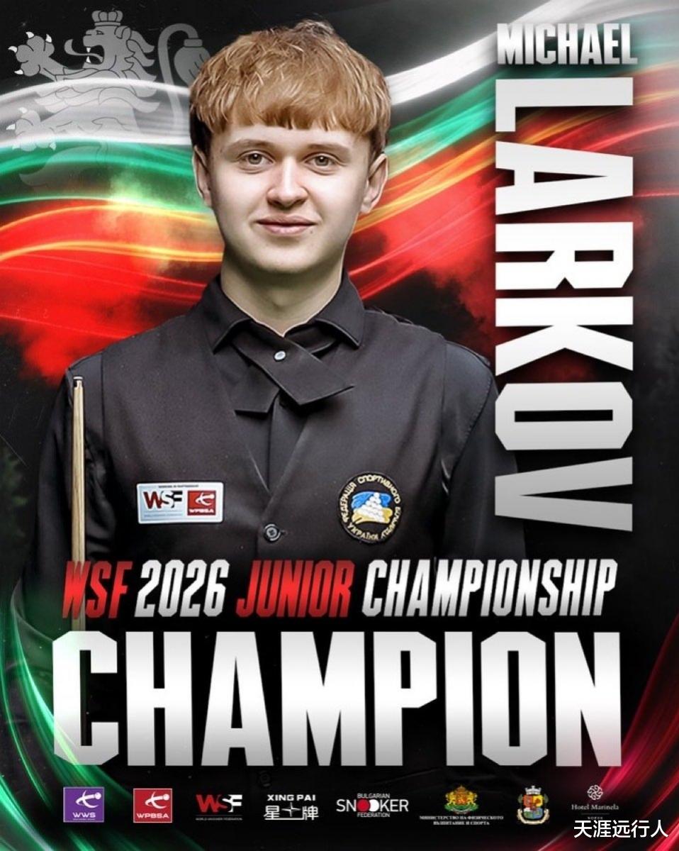 在保加利亚索菲亚马里内拉酒店进行的2026WSF青年斯诺克锦标赛决赛中,来自乌克兰的17岁小将迈克尔·拉尔科夫,以5-2战胜中国王信伯,夺得冠军,从80名球员中脱颖而出,生涯首次获得为期两个赛季(2026/7和2027/8赛季)的职业资格。