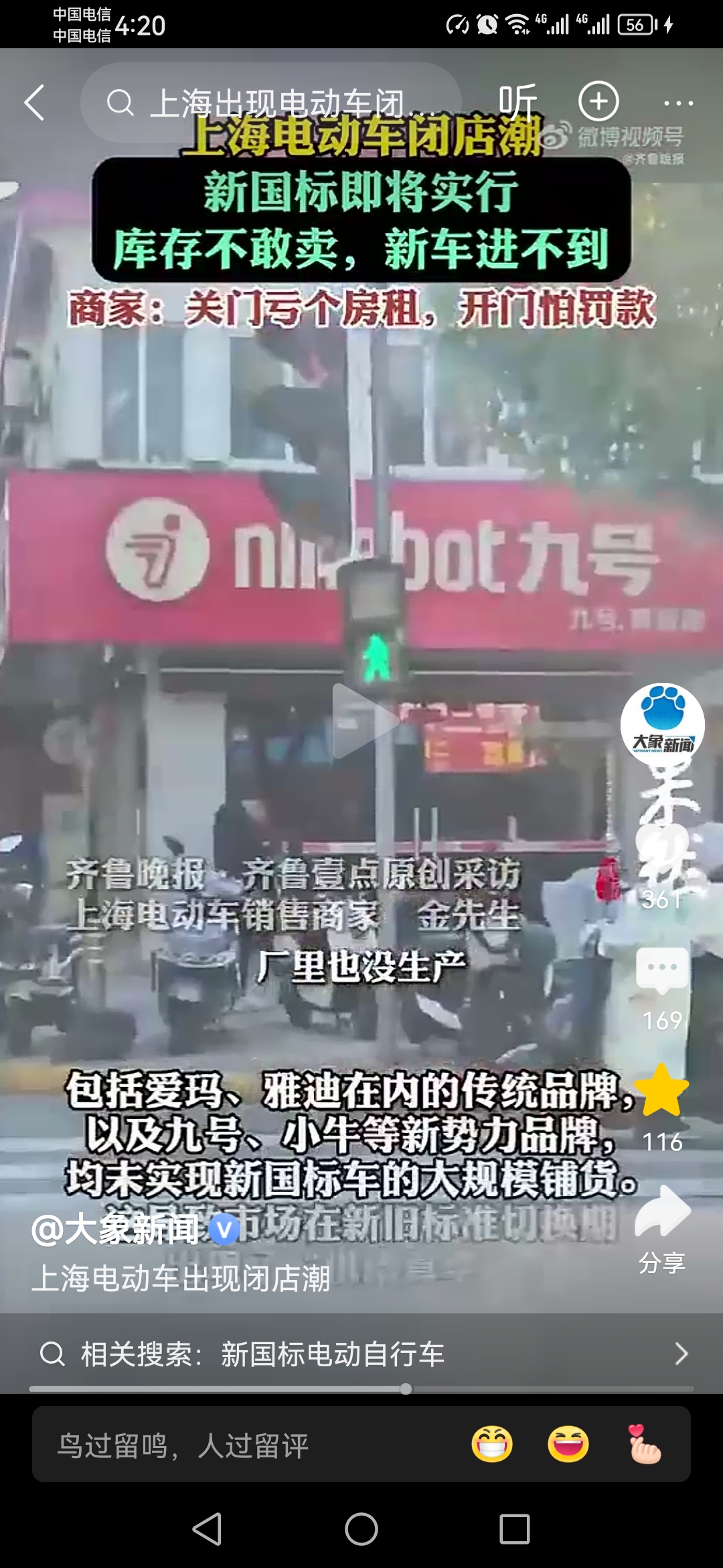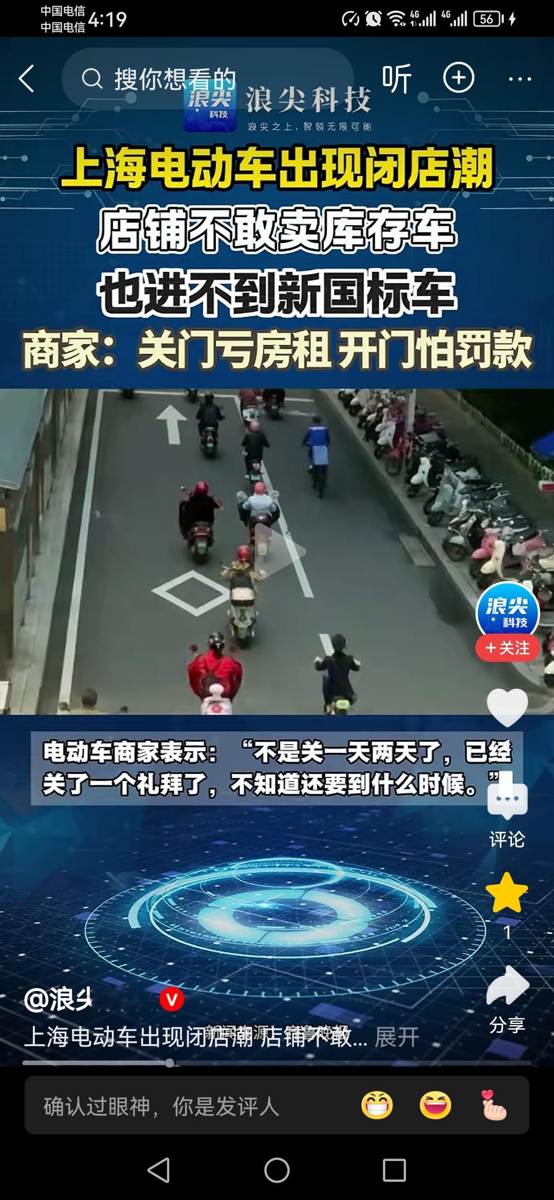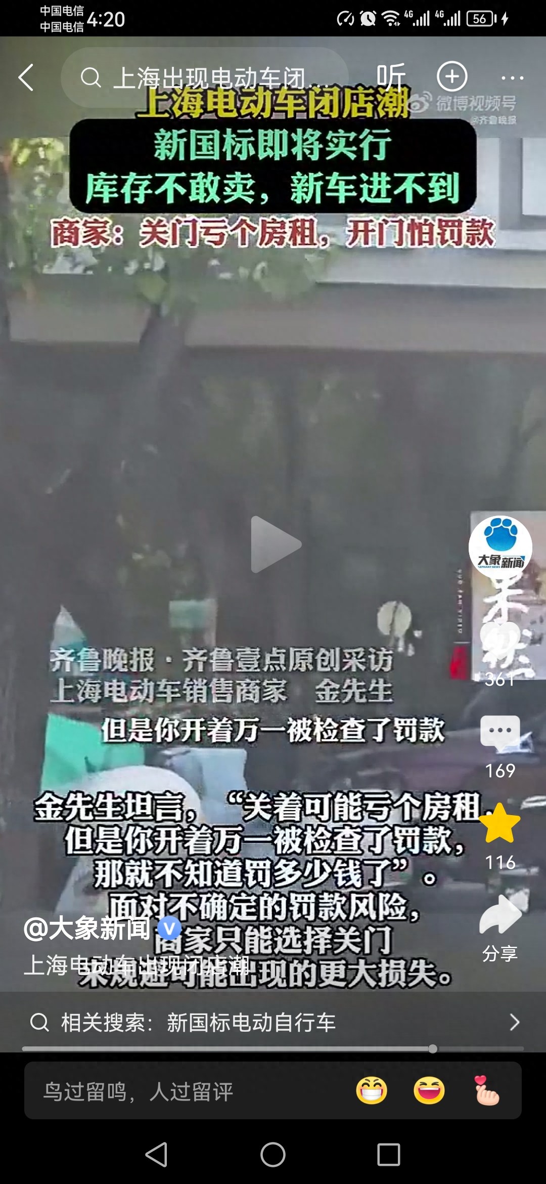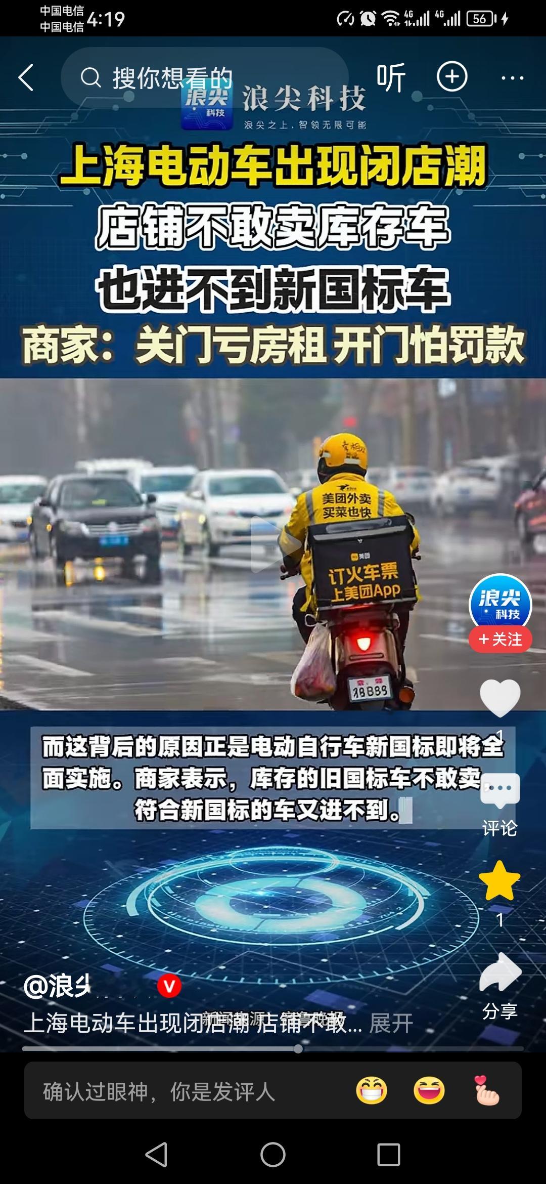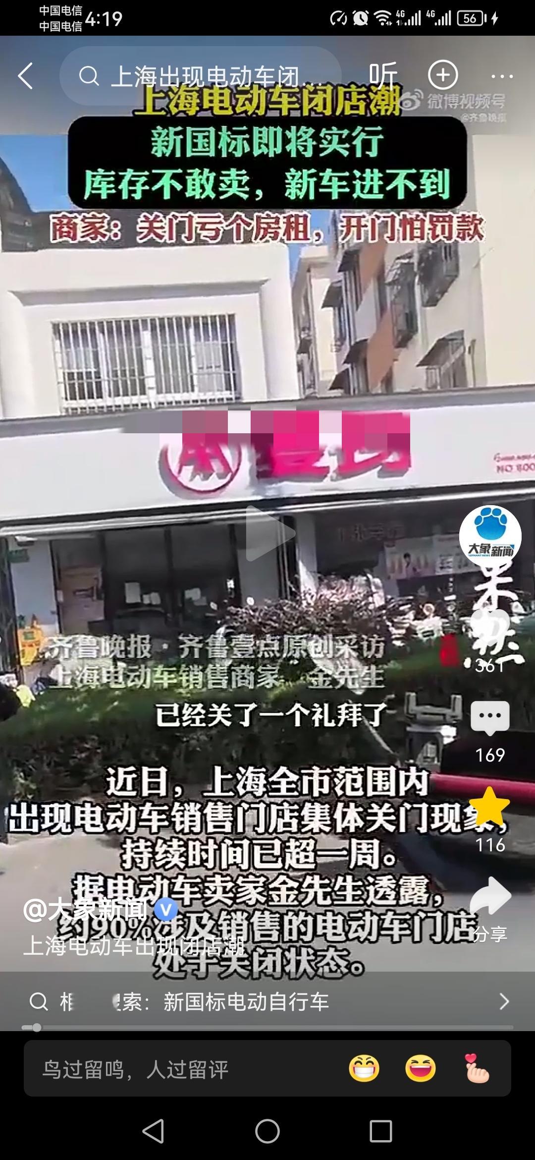 更扎心的是,有电动车店的老板表示,目前已经停止营业一个星期了,具体什么时候开门他们也不知道,大家就会出现你看我,我看你的从众效应,可能真的有人想买新新国标的车子,因为这些电动车商家不开门或者是根本没有车子,也买不了啊!