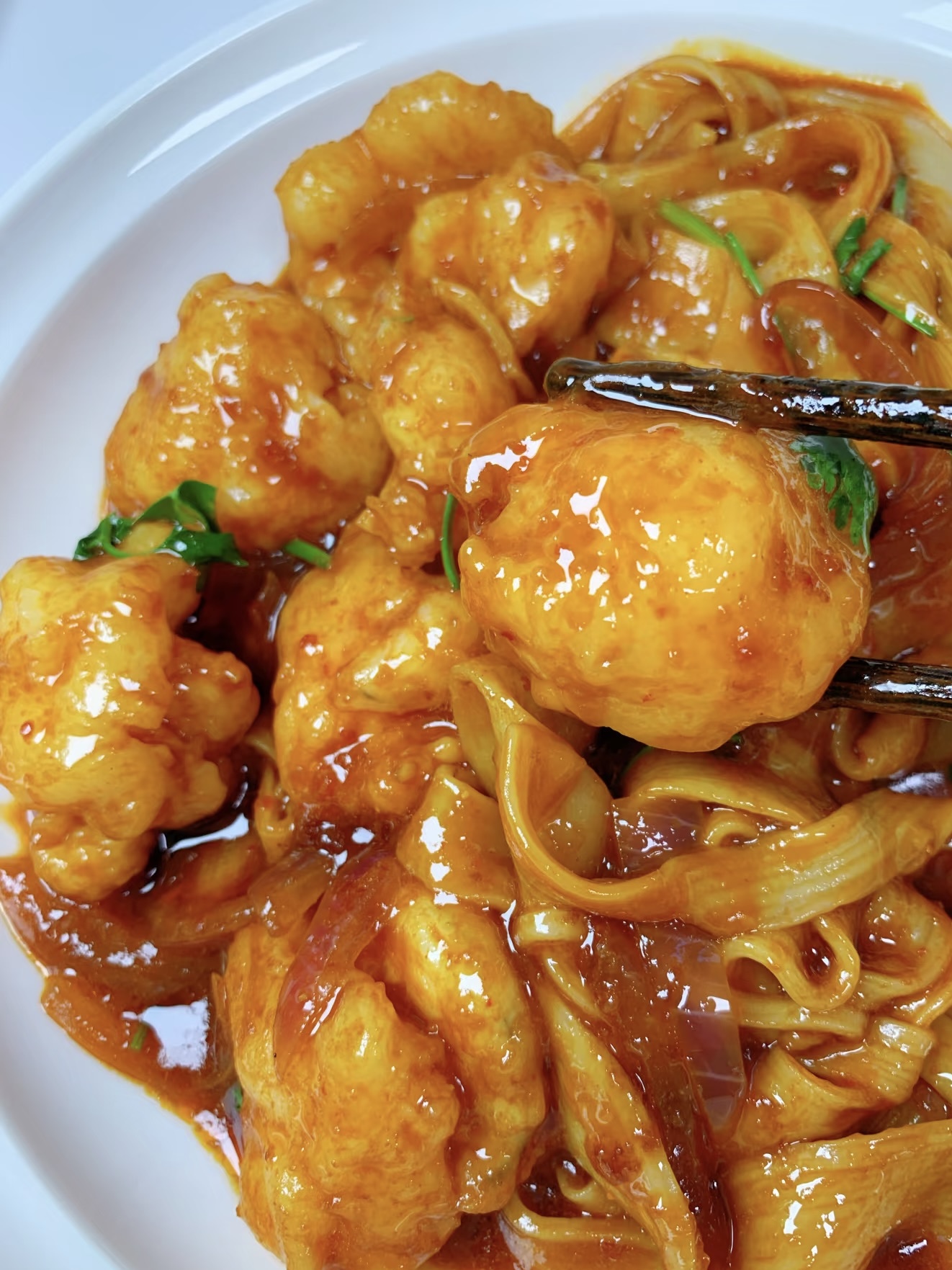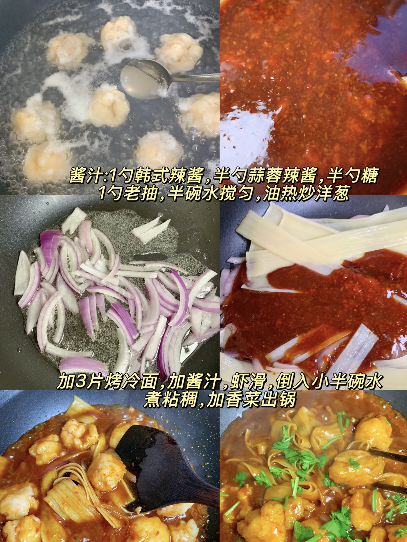 将调好的酱汁倒入锅中,大火烧开后,转小火煮至酱汁浓稠。酱汁会逐渐裹在冷面和虾滑上,让每一口都充满酸辣鲜香。当酱汁变得浓稠时,加入适量的香菜末,翻炒均匀后即可出锅。