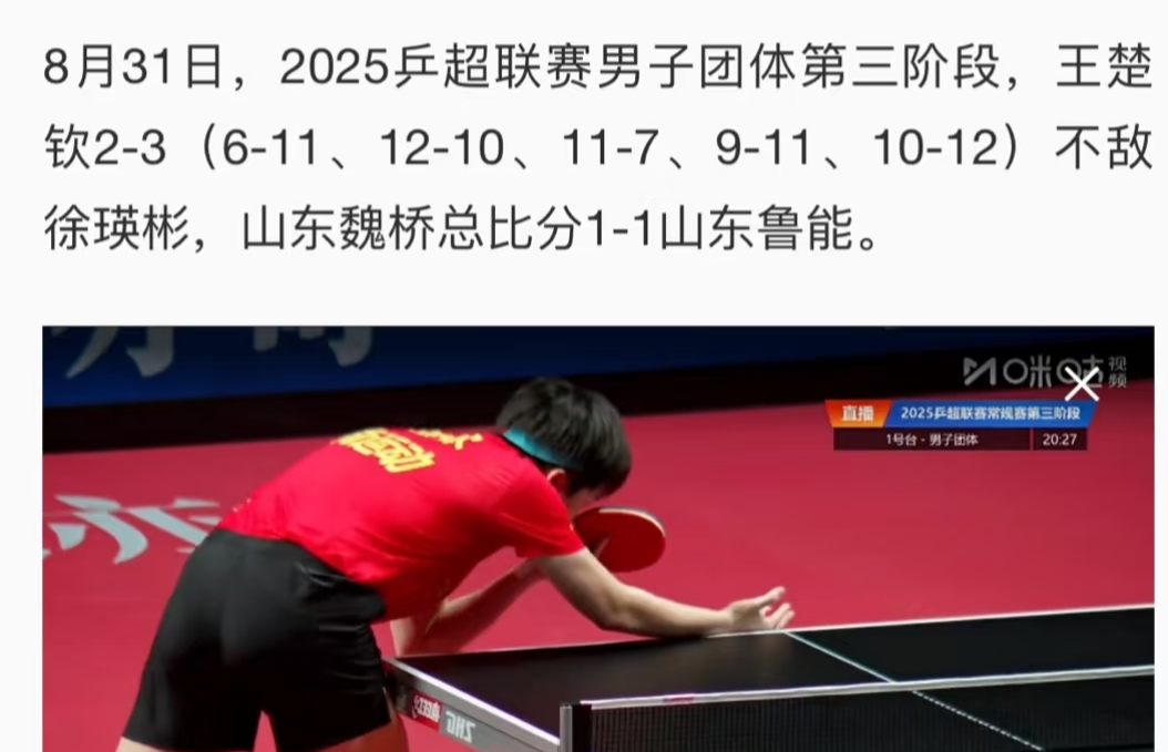 8月31日晚2025乒超第三阶段焦点战,世界第二的奥运冠军王楚钦2-3(6-11、12-10、11-7、9-11、10-12)不敌“内战王”徐瑛彬,13连胜止步。