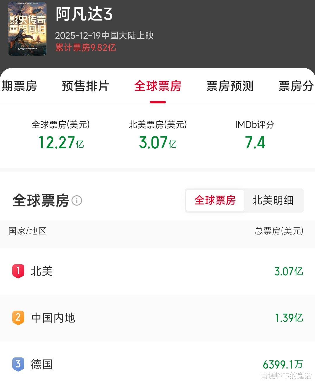 《阿凡达3》的全球票房数字定格在12.27亿美元。在中国内地,上映19天票房9.82亿元,这周冲破10亿已无悬念。