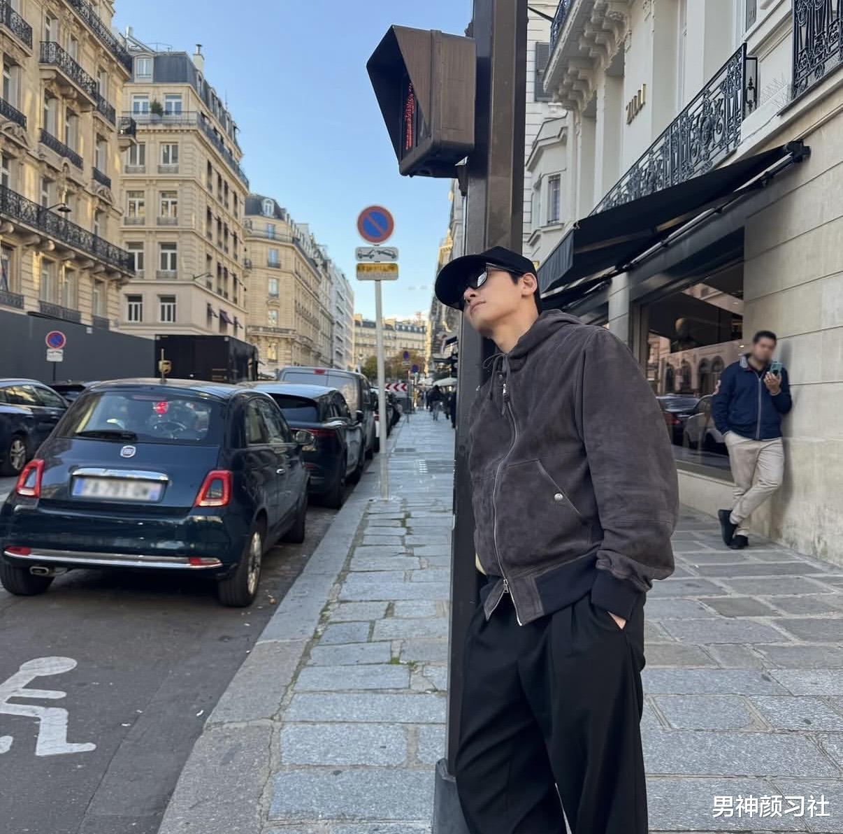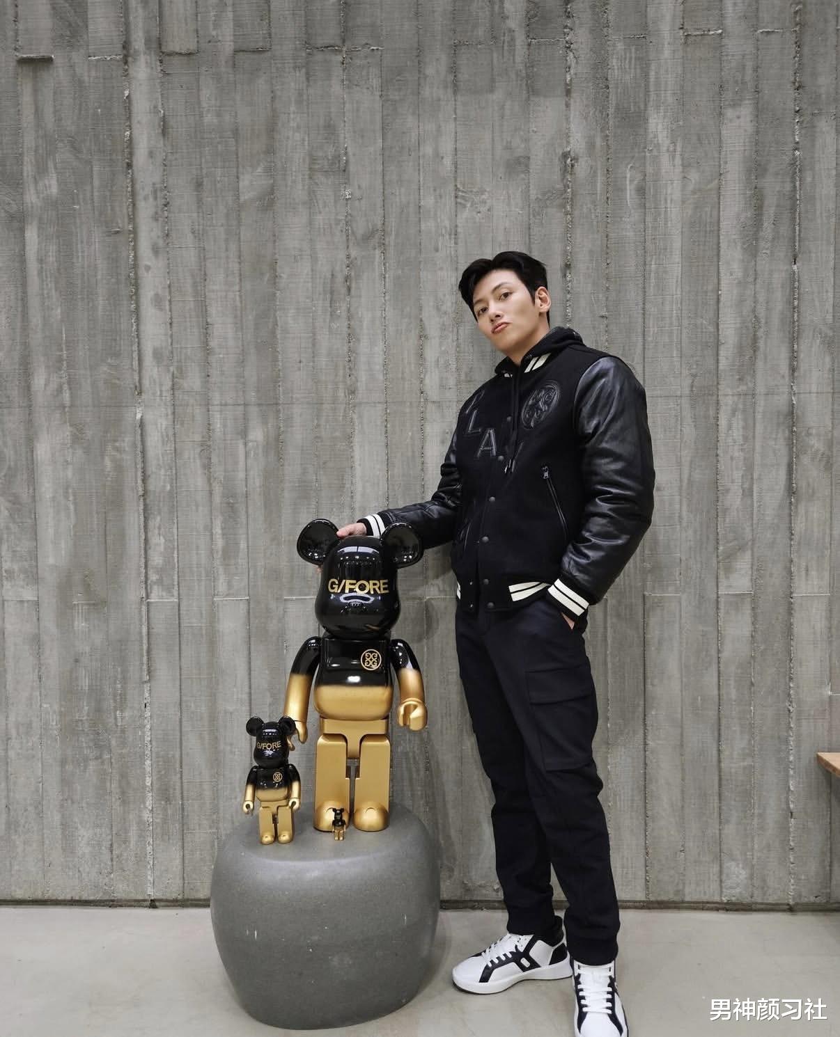 棒球服也是他很常出现的单品,搭配工装裤、运动鞋,整体就是很典型的韩系休闲风:年轻、干净、不刻意。这个穿搭也非常减龄,适合30+的男生模仿。