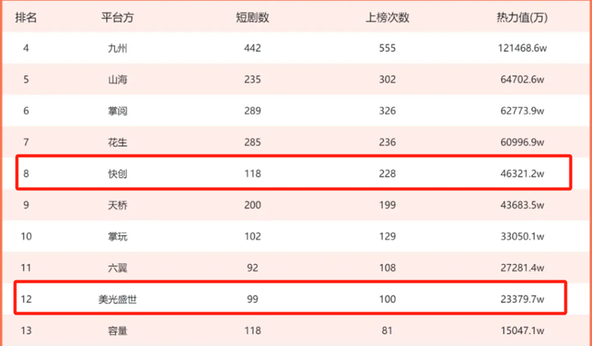根据DataEye2025H1百强平台榜,快创和美光盛世分别位列第8和第12名,合计映宇宙系作品上榜达328次,上榜短剧达217部,累计热力值约7亿。