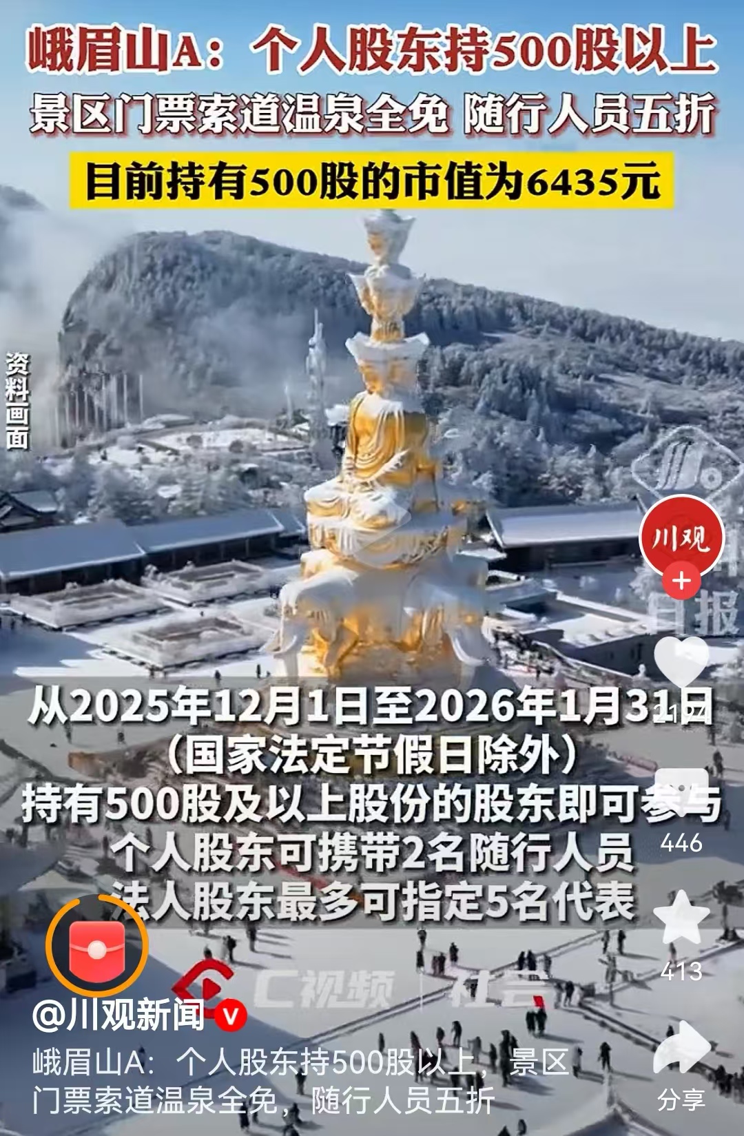 还有五芳斋在端午节期间,向持股1000股以上的股东赠送“丰年五芳”粽子礼盒,祥源文旅推出股东专享的“祥源茶”采购优惠。但是最终上市公司峨眉山的力度最大,持有500股的个人股东和法人股东,游览峨眉山景区,可以得到免费或者半价或者特定优惠价折扣的待遇。不但可享受峨眉山景区进山门票免票回馈,乘坐索道也免费;个人股东的随行家属可以享受到5折优惠,乘坐索道半价优惠。
