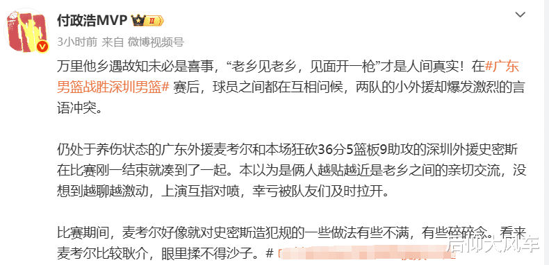 不妨来看看媒体人付政浩的报道,付老师认为,导致两人赛后发生冲突的原因,很可能是在比赛期间,麦考尔好像就对史密斯造犯规的一些做法有些不满,有些碎碎念。看来麦考尔比较耿介,眼里容不得沙子。