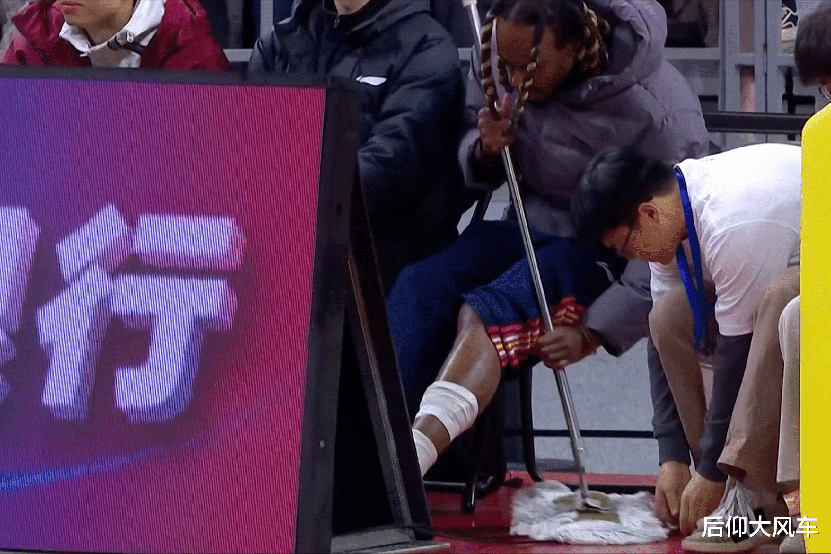 麦考尔是广东队本赛季签下的重要控卫外援,但因为训练期间膝盖受伤,导致现在一场比赛都没得上,最近这段时间,麦考尔一直留在东莞大本营康复训练,只要主场有比赛他就会来现场观战给队友呐喊鼓励,昨晚的比赛麦考尔也是一直在场下不遗余力给队友鼓励,比赛暂停期间他也没有闲着,甚至还拿起了拖把帮忙场边的工作人员拖地。