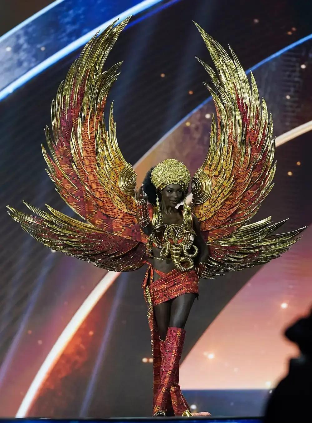 科特迪瓦小姐选择了鲜艳的红橙色造型,向西非母系社会——阿坎族致敬。