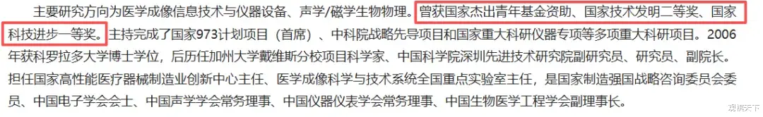 他的成绩很突出, 他带着团队造出中国首台3.0T高场磁共振, 直接挑战了GE、西门子、飞利浦的垄断地位, 之后又推出全球第一台5.0T超高场磁共振, 并让它走向市场,2020年国家科技进步一等奖和国家技术发明二等奖的名单上, 都有他, 2023年11月他被选为中科院院士, 当时他才四十六岁, 在同批人里很年轻。