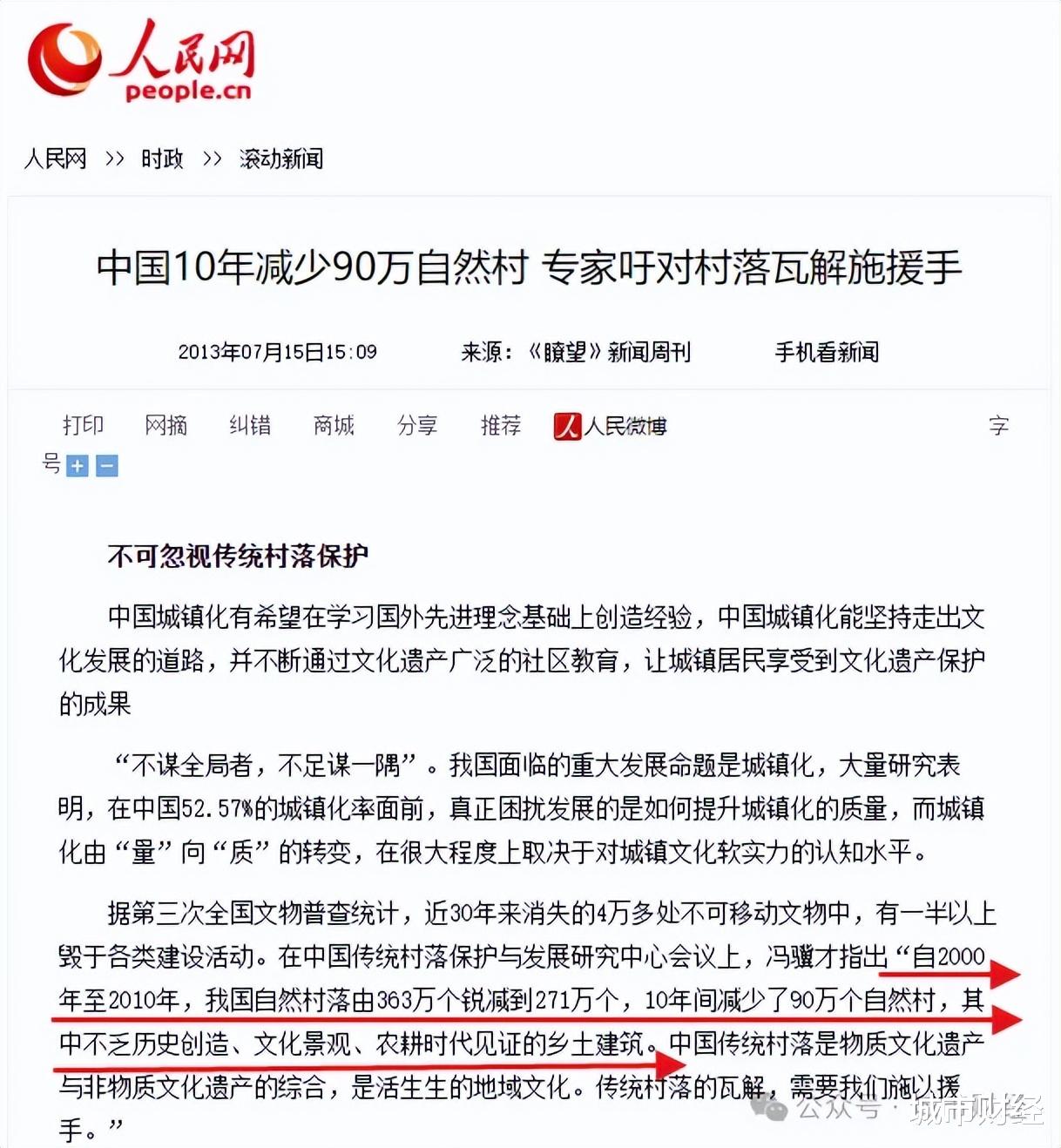 2013年,人民网等多家官方媒体就披露过一组数据,自2000年至2010年,我国自然村由363万个锐减至271万个,10年间减少了90多万个,其中包含大量传统村落。