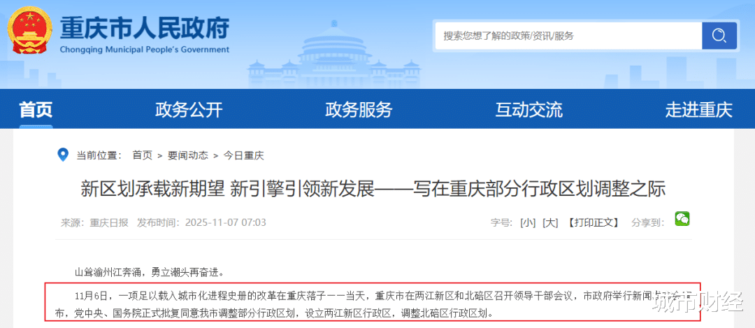 重庆日报在11月7日发布的文章《新区划承载新期望 新引擎引领新发展——写在重庆部分行政区划调整之际》中,给出了详细解释: