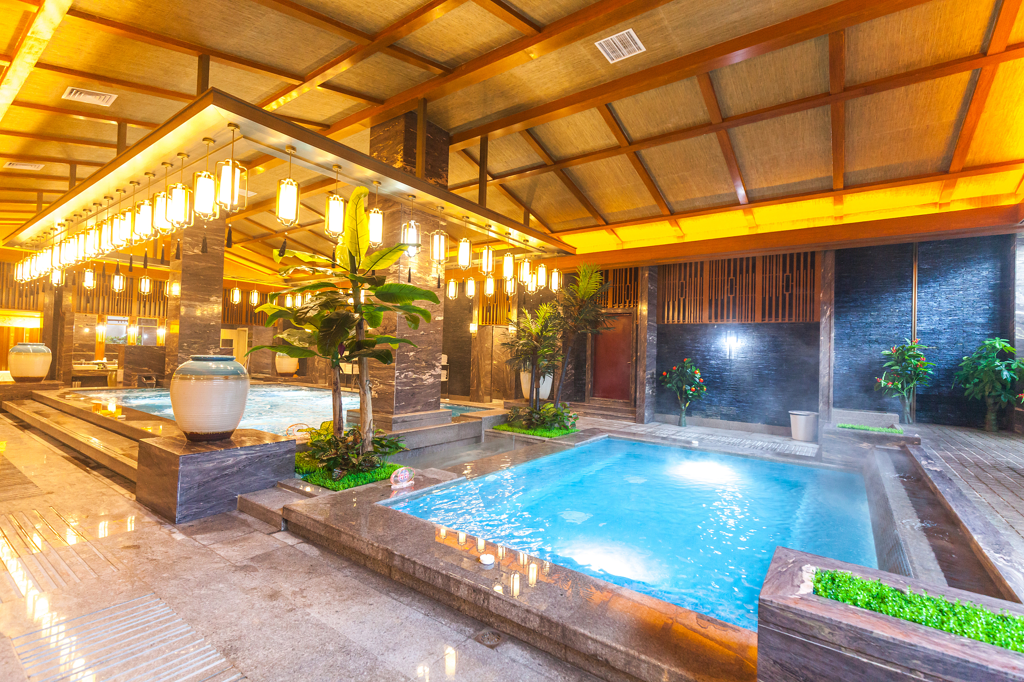 度假村的露天泡池区设计独具匠心,将苏式园林与日式枯山水完美融合。红酒池被设计成高脚杯形状,花瓣池则用天然鹅卵石铺就,最受欢迎的是隐藏在竹林深处的私密汤屋,需要提前两周预定。工作人员介绍:"周末80%的客人来自北京和天津,很多人周五下班开车过来,周日晚上才依依不舍地离开。"