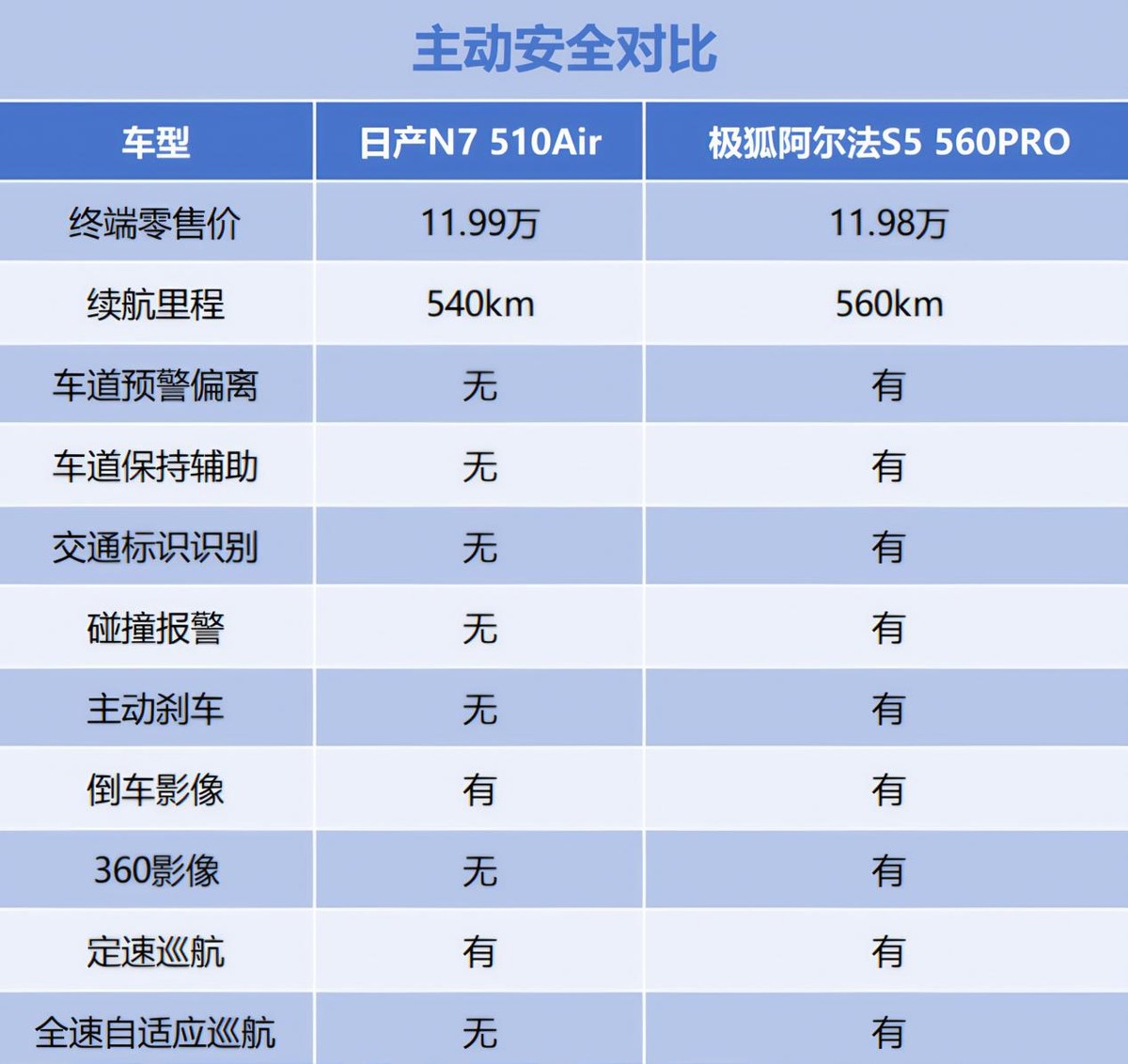 我们今天没有比较外观,也不比较内饰,审美终究是萝卜白菜,各有所爱的。本来我以为销量比极狐阿尔法S5更高的合资纯电车型日产N7能在产品力上拥有和极狐阿尔法S5互有长短的地步,没想到,单从同价格产品展示出来的基础素质和配置诚意来看,极狐阿尔法S5要突出很多。