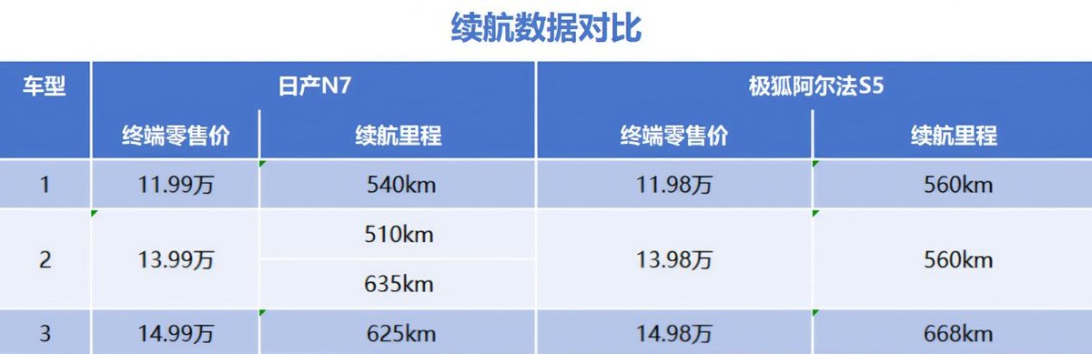 而对比来看,除了指导价格为13.99万的日产N7 625Pro版本外,极狐阿尔法S5其他车型的续航,都要高于同价格的日产N7,而对于纯电车型来说,多出的这些续航里程,很有可能就是关键的时候,应急的时候,你能不能开到充电站的底气所在,也是决定你日常用车的时候是否会有续航焦虑的核心因素。作为对比,不论是从最低配还是最高配,极狐阿尔法S5都比同价格区间的日产N7续航里程长了几十公里,那如果让你来说,这是诚意的问题呢?还是技术的因素呢?