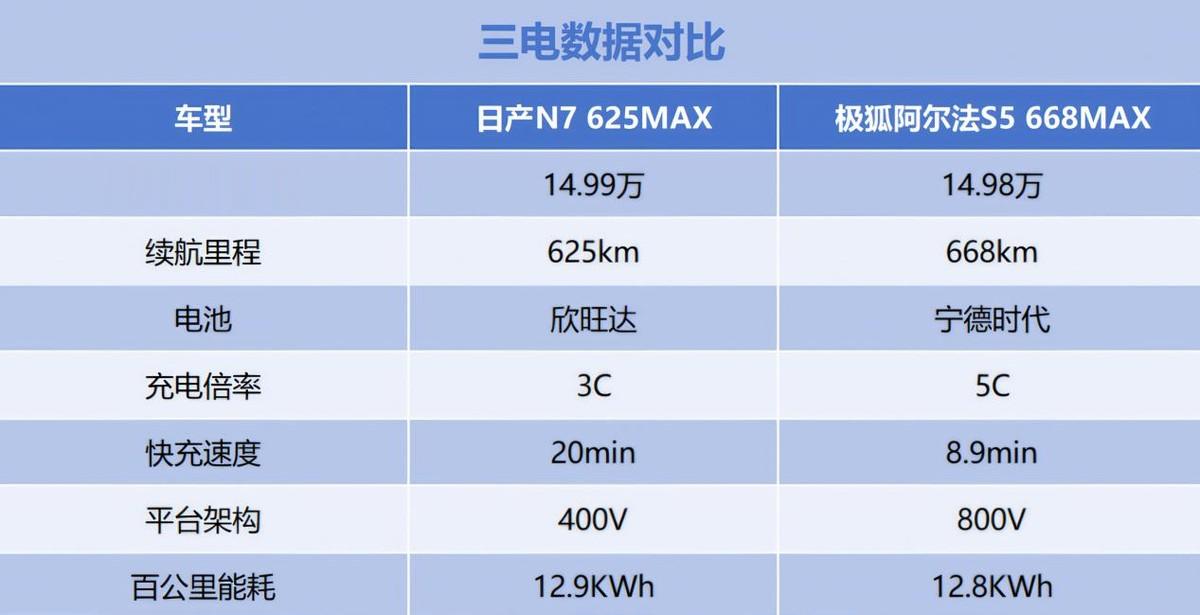 而作为对比,日产N7全系仅仅搭载了来自目前行业二线品牌欣旺达品牌的电池,充电也仅仅能达到3C的倍率。整车架构也仅仅只有400V的架构,因此不论是从电池品牌、充电速度和平台架构上,都和搭载宁德时代的电池拥有800V架构的极狐阿尔法S5不可同日而语。