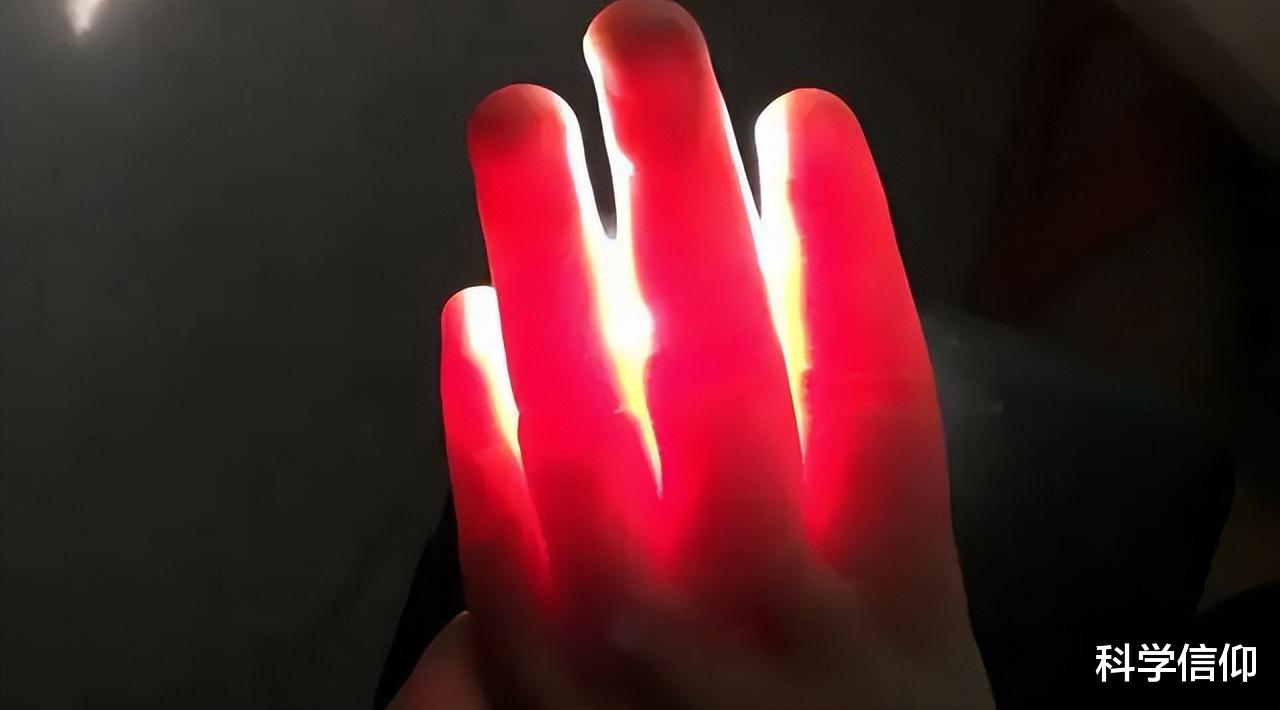 那么,怎么在不抽血的情况下就能够知晓血液中氧合血红蛋白与脱氧血红蛋白的多少呢?现在让我们回想一种情况,当我们用手电近距离照射手指时,手指会变为红色,这是因为手指对于不同波长光的透射率不同,红光吸收得少,透出来的自然就多。