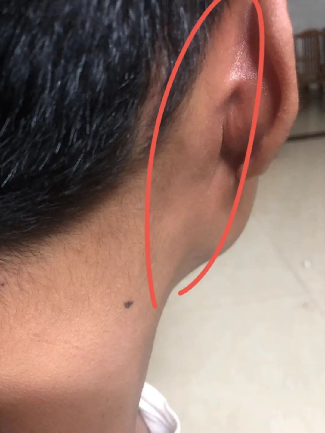 一位受试者术后能看见耳朵侧边的导线形状。受访者供图
