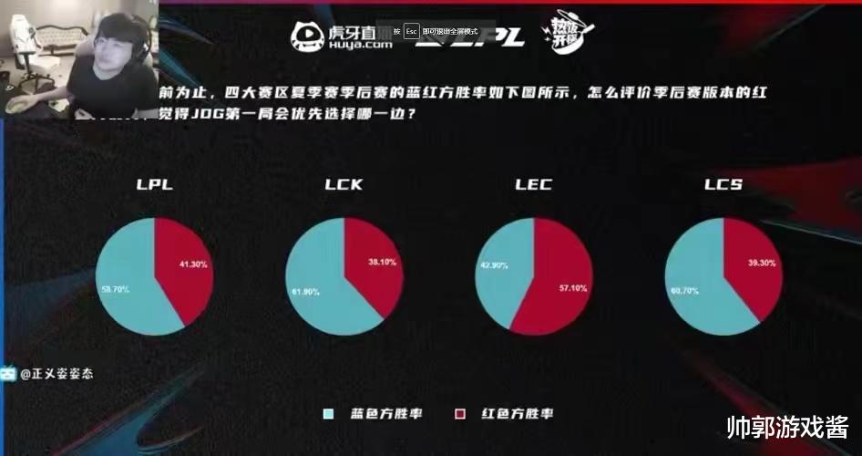 与此同时姿态还针对官方给出的四大赛区红蓝双方胜率统计图进行了一波评价,期间当看到唯独LEC赛事红色方胜率高之后,姿态也忍不住调侃道:就很简单的一点,教练也不会bp,游戏理解也只是随便玩玩。Letme:还行吧我看他们教练挺会bp的啊进去里面啥英雄都选。姿态大笑:那肯定啊,你英雄选择越多那个康特关系就越大啊。此番说法,同样也得到君泽的认可。