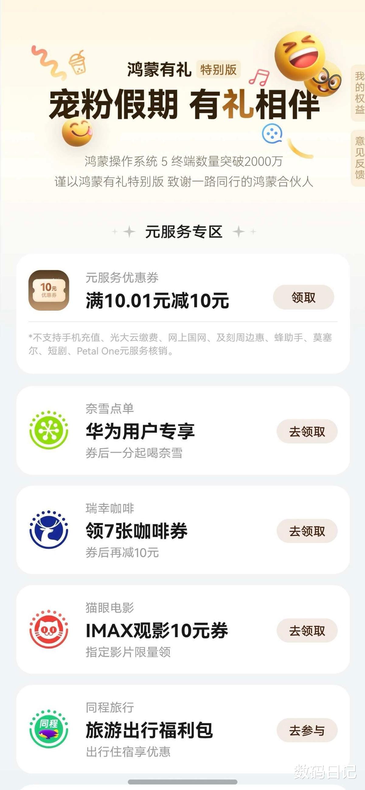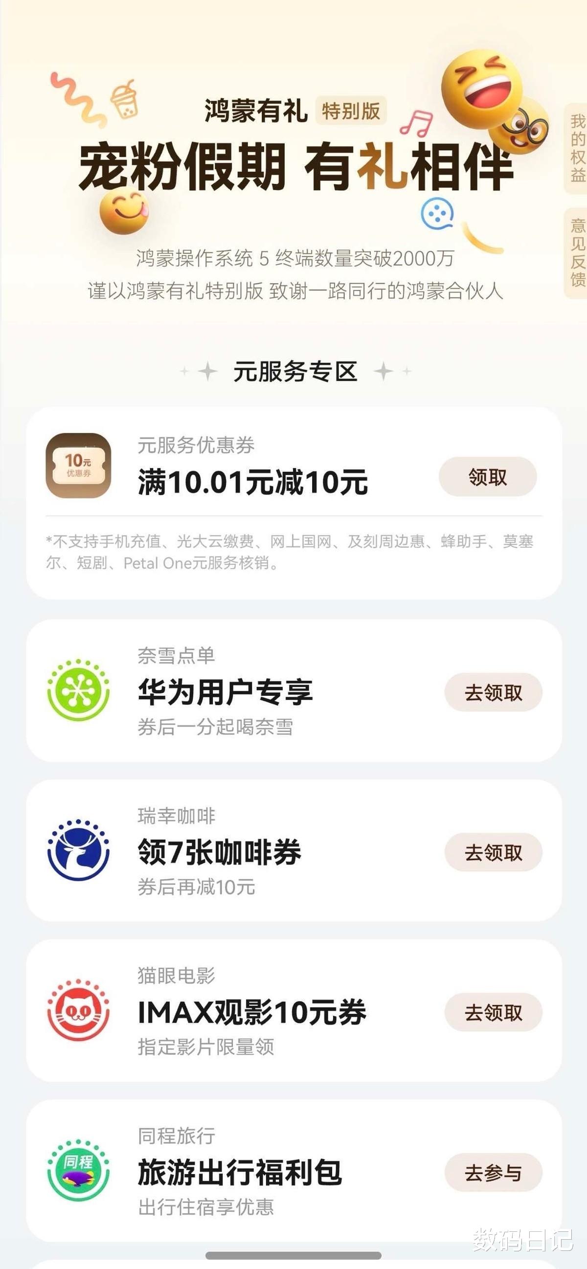 为庆祝鸿蒙5终端数量突破2000万,华为在国庆期间特意推出感恩回馈活动——「鸿蒙有礼」特别版,每天可以领各种福利,太香啦!手机系统升级到鸿蒙5及以上,在桌面右滑到负一屏,就能看到活动入口。福利很多很实用,覆盖吃喝玩乐、交通出行,特别是瑞幸和奈雪的茶的专属优惠,太合我心意啦。