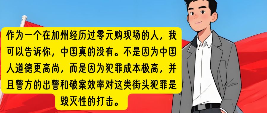 一位中国留学生回复到,“作为一个在加州经历过零元购现场的人,我可以告诉你,中国真的没有。不是因为中国人道德更高尚,而是因为犯罪成本极高,并且警方的出警和破案效率对这类街头犯罪是毁灭性的打击。”