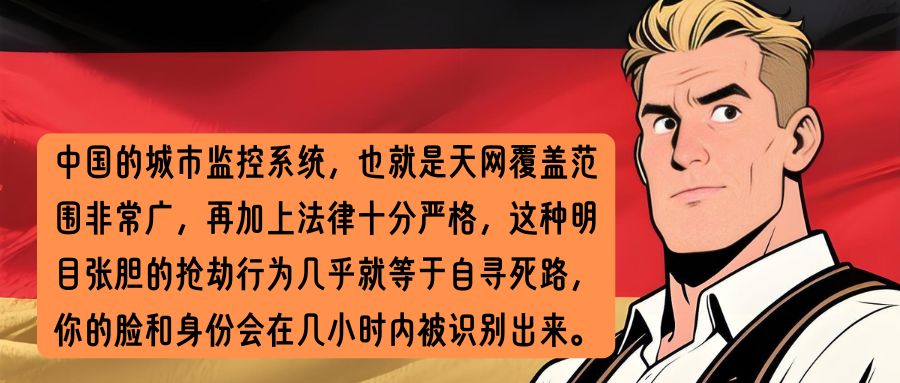 德国网友则表示:“中国的城市监控系统,也就是天网覆盖范围非常广,再加上法律十分严格,这种明目张胆的抢劫行为几乎就等于自寻死路,你的脸和身份会在几小时内被识别出来。”
