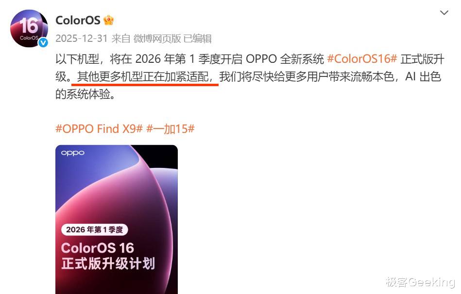 自 2025 年 10 月以来,新一代 ColorOS 16 系统持续推送适配机型升级,如今 2026 年来了,现在 OPPO 官方公布了今年第一季度 ColorOS 16 正式版的升级计划和适配机型名单,而且时间表给具体到了日子,这表明将有越来越多 OPPO 和一加手机用户能升级体验到全新一代系统了。