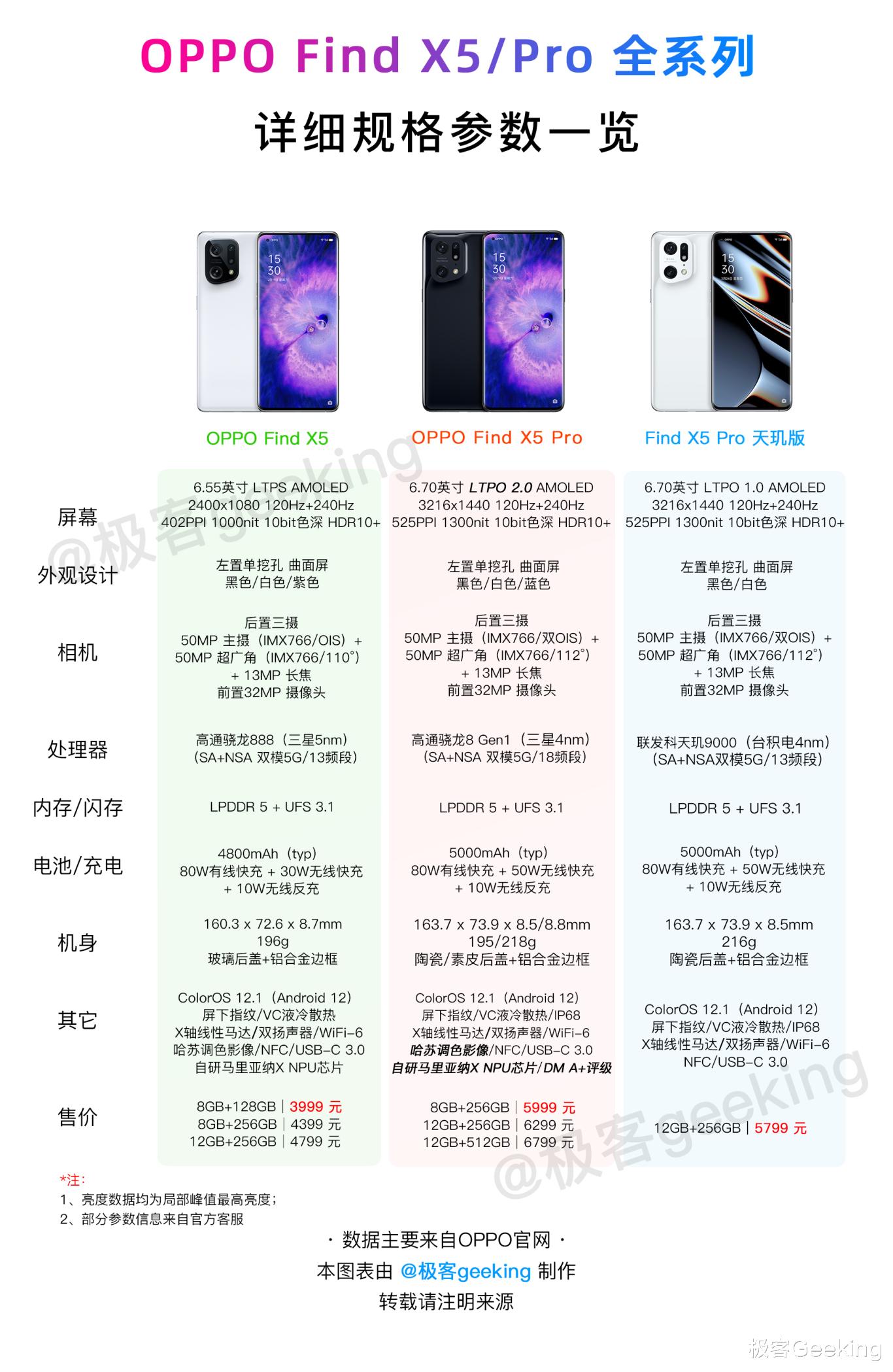 这里附上 OPPO Find X5 全系列三款旗舰手机的一张图配置完全总结图: