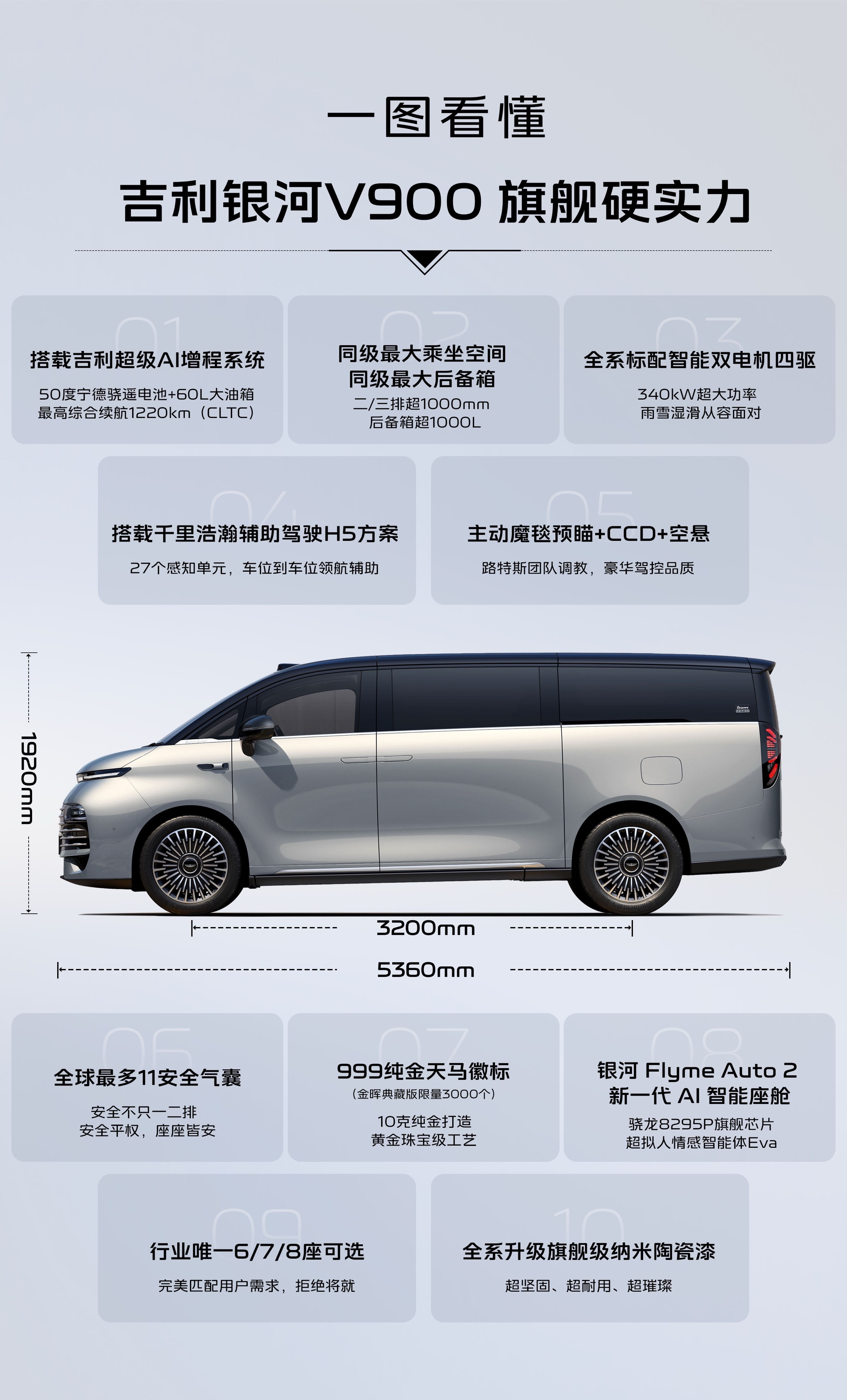 银河V900的车身尺寸为长5360mm/宽1998mm/高1920(1940)mm,轴距长度为3200mm,新车采用以空间为导向的整车架构设计,采用短L113和行业尺寸最紧凑的“超级AI增程系统”,为银河V900的前排座舱滕让出150mm纵向空间,让新车拥有91.8%的超高得房率。