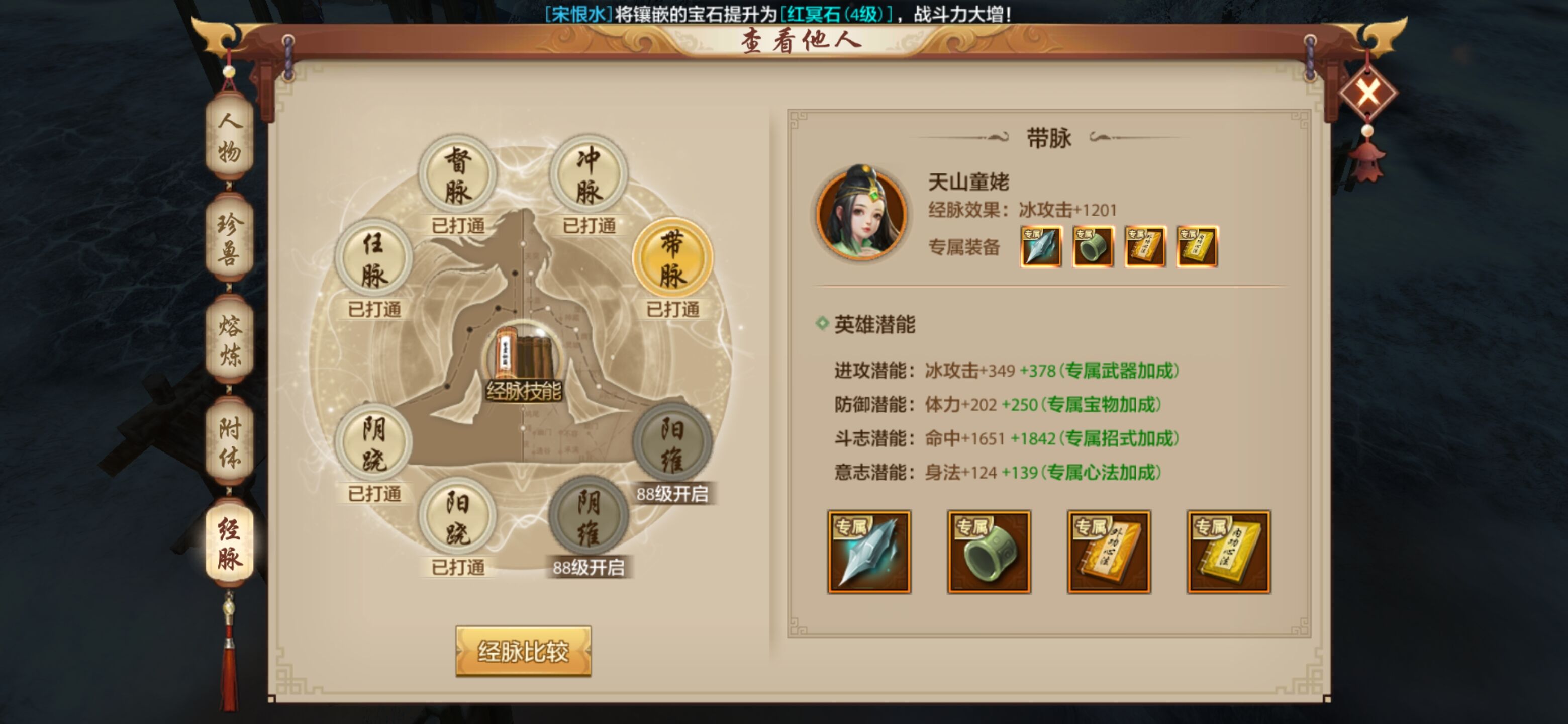 建议段誉、乔峰、慕容复、李秋水、丁春秋、段延庆、童姥和无崖子。保证属性攻击是肯定的!至于乔峰和李秋水的选择,还是一样,武当缺生存,打体力没有错,有人会问命中会心怎么办,经脉最重要的是属性体力身法,英雄谱也是,其次就是一级属性(一级属性包括体力,身法,灵气,力量)所以我们除了属性,一定要重视一级属性,所以一定要用一级属性作为第二选择。