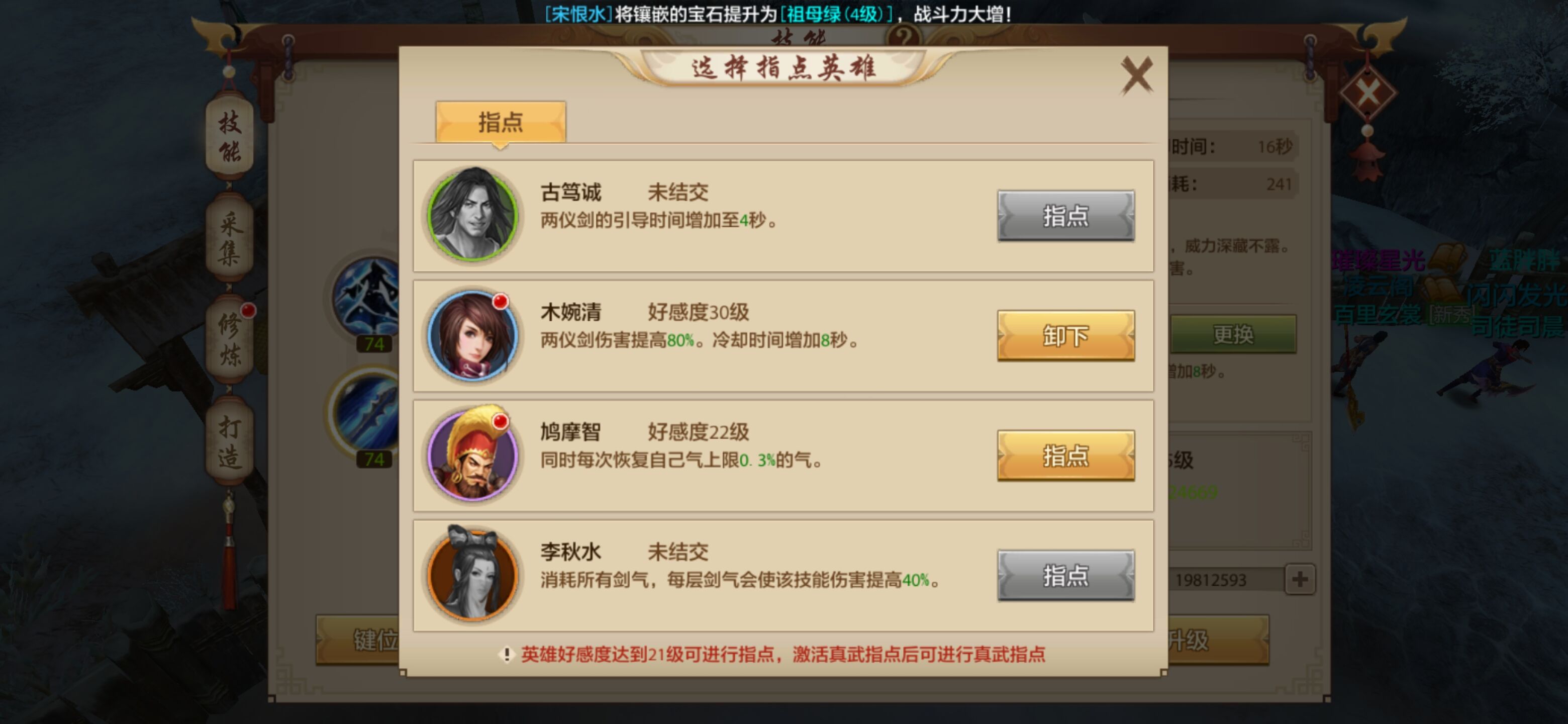 3.两仪剑选择李秋水指点,增强剑气伤害。两仪剑需要引导,PK没有那么好的输出环境,古笃诚和鸠摩智太过鸡肋,而木婉清只是增加40%,比起李秋水的叠加,差了许多火候。