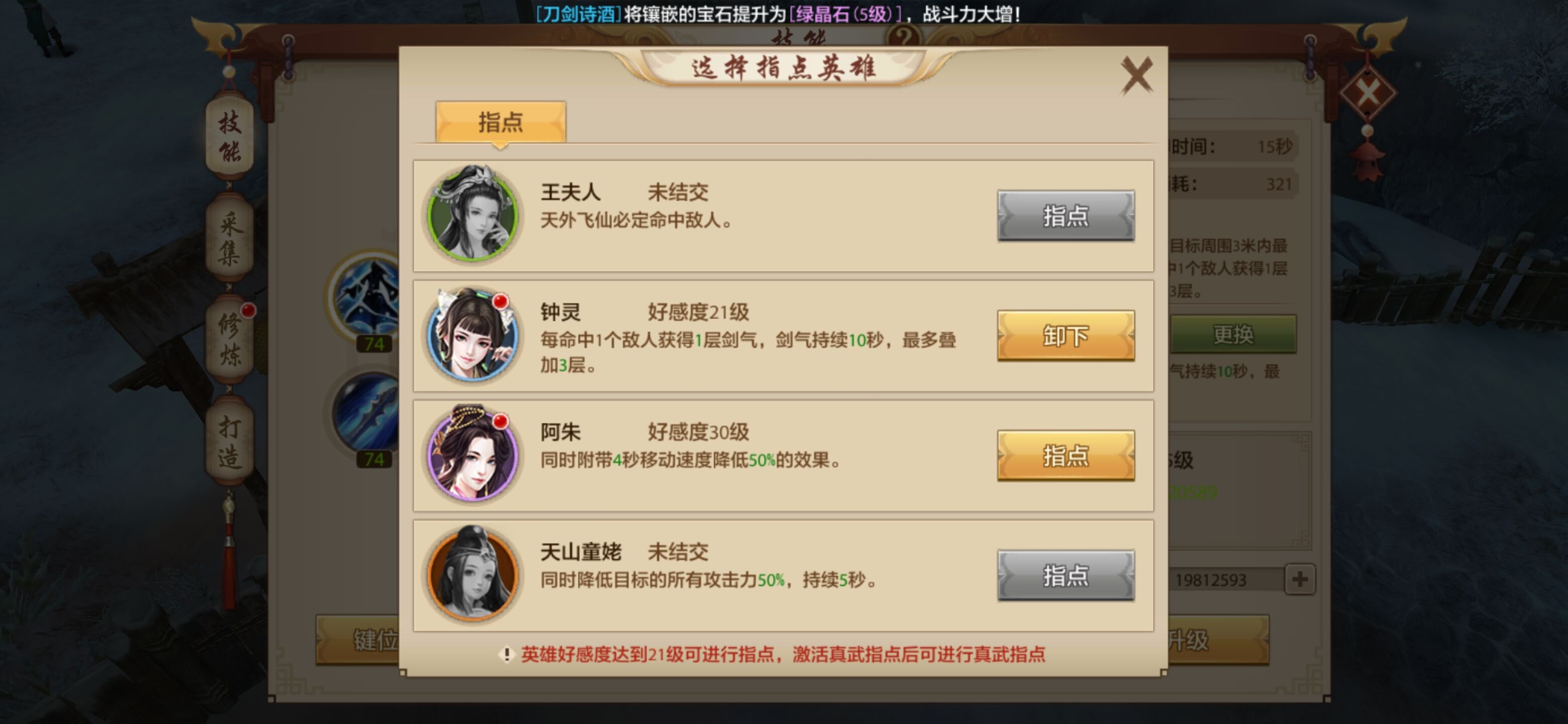 2.天外飞仙选择童姥指点,性价比最高。有争议的可能是钟灵,叠加剑气确实诱人,但是论起实用性还是童姥指点更好,作为一种限制敌人手段,童姥的指点是无可厚非的。