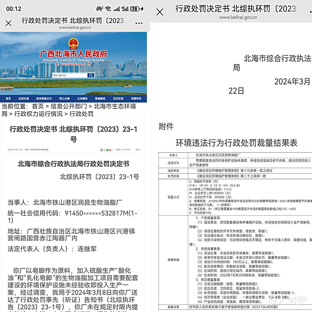 此后,北海市生态环境局于2024年3月22日,对润昌油脂厂作出处罚,罚款231136元,对该厂实际控制人梁某正罚款55004元。