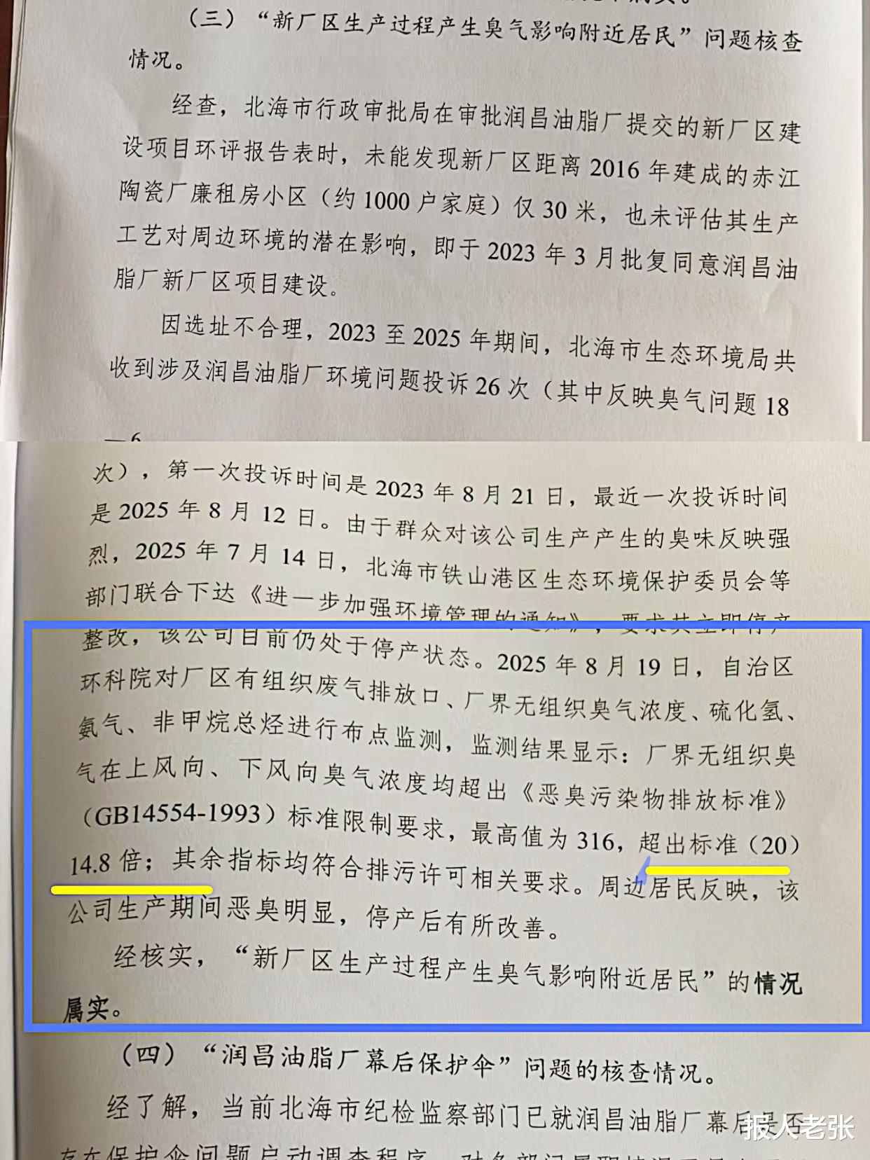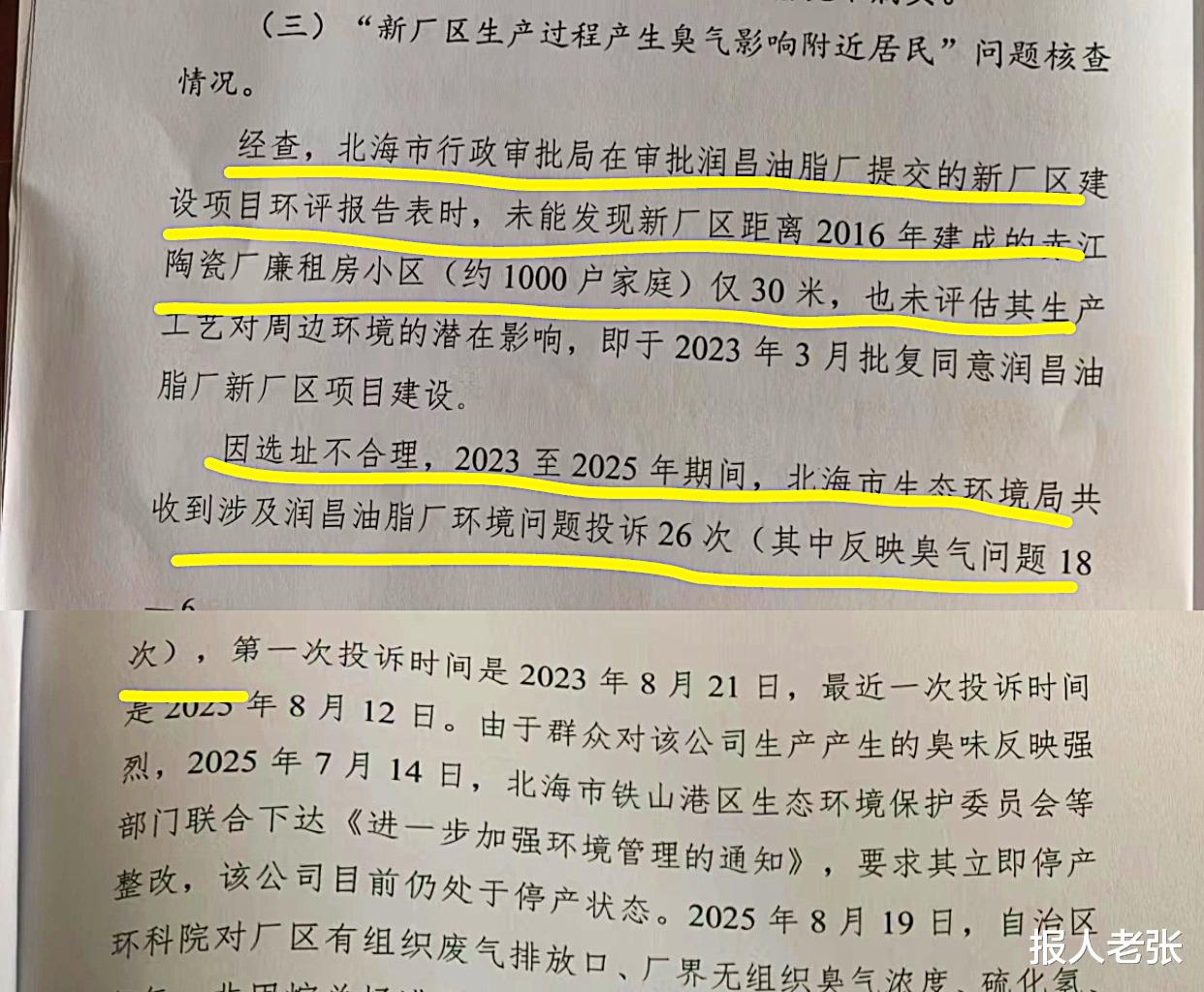 选址不合理,如何过环评?北海市行政审批局谁来当责?在润昌新厂臭气对附近居民影响的调查中,区生态环境厅查实:“北海市行政审批局在审批润昌油脂厂提交的新厂区建设项目环评报告表时,未能发现新厂区距离 2016 年建成的赤江陶瓷厂廉租房小区(约 1000户家庭)仅30米,也未评估其生产工艺对周边环境的潜在影响,即于2023年3月批复同意润昌油脂厂新厂区项目建设。因选址不合理,2023 至2025 年期间,北海市生态环境局共收到涉及润昌油脂厂环境问题投诉26次(其中反映臭气问题 18次)。”