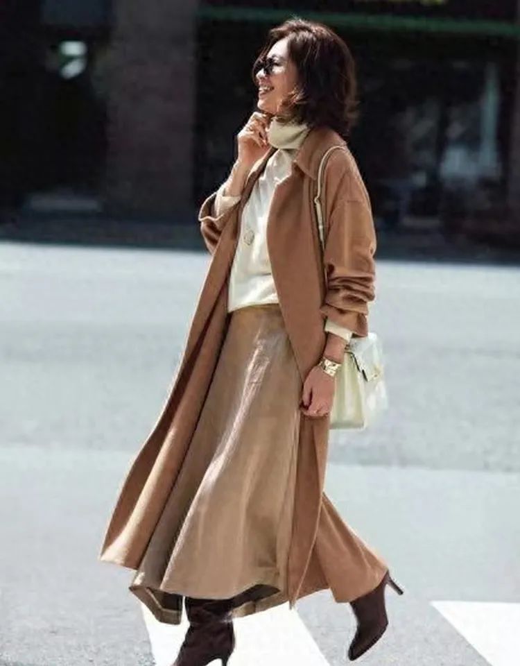 大量感的冬季服装,在造型中的占比面积都比较大,如果不注重面料选择,看着软塌、褶皱、起球的话,就会给人感觉很廉价,随之拉低档次。切记要强调服装面料质感,垂感好、挺括感强,搭配合身的版型,穿在身上才显档次、提气质,给人感觉更加优雅大气。二、女人年纪大了,冬天穿裙子要注意这3点(1)裙长过膝,适当露肤