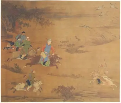 明代宫廷画院复兴了宋代院体画的写实风格。为记录帝王武功与宫廷活动,狩猎主题绘画盛行。在此类作品中,狼作为被追逐的猎物,首次被清晰地描绘。代表性作品如明代宫廷画家商喜的 《明宣宗射猎图》 。画中对狼的形态——精瘦的躯干、竖立的耳朵、尤其是蓬松下垂的尾巴——进行了准确的刻画,使其从“犬属”的模糊概念中分离出来,成为一个被客观记录的生物。此时,狼的形象服务于政治叙事,功能在于衬托帝王的勇武与权威。